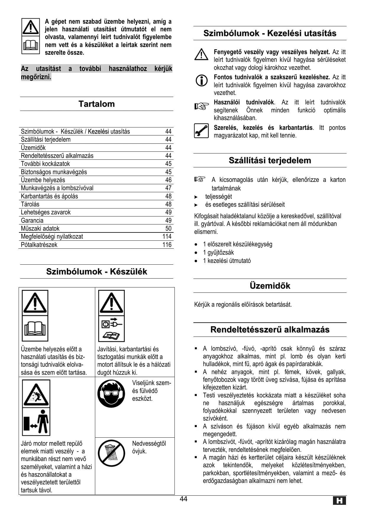 Tartalom Szimbólumok - Készülék / Kezelési utasítás Szállítási terjedelem Üzemidők Rendeltetésszerű alkalmazás További kockázatok Biztonságos munkavégzés Üzembe helyezés Munkavégzés a lombszívóval Karbantartás és ápolás Tárolás Lehetséges zavarok Garancia Műszaki adatok Megfelelőségi nyilatkozat Pótalkatrészek