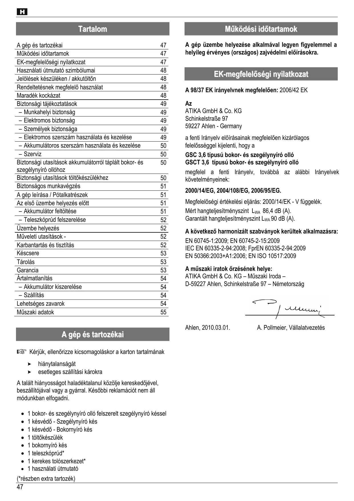 A gép üzembe helyezése alkalmával legyen figyelemmel a helyileg érvényes (országos) zajvédelmi előírásokra. EK-megfelelőségi nyilatkozat A 98/37 EK irányelvnek megfelelően: 2006/42 EK ATIKA GmbH & Co. KG Schinkelstraße 97 59227 Ahlen - Germany a fenti Irányelv előírásainak megfelelően kizárólagos felelősséggel kijelenti, hogy a GSC 3,6 típusú bokor- és szegélynyíró olló GSCT 3,6 típusú bokor- és szegélynyíró olló megfelel a fenti Irányelv, továbbá az alábbi Irányelvek követelményeinek: 2000/14/EG, 2004/108/EG, 2006/95/EG. Megfelelőségi értékelési eljárás: 2000/14/EK - V függelék. Mért hangteljesítményszint LWA 86,4 dB (A). Garantált hangteljesítményszint LWA 90 dB (A). A következő harmonizált szabványok kerültek alkalmazásra: EN 60745-1:2009; EN 60745-2-15:2009 IEC EN 60335-2-94:2008; FprEN 60335-2-94:2009
