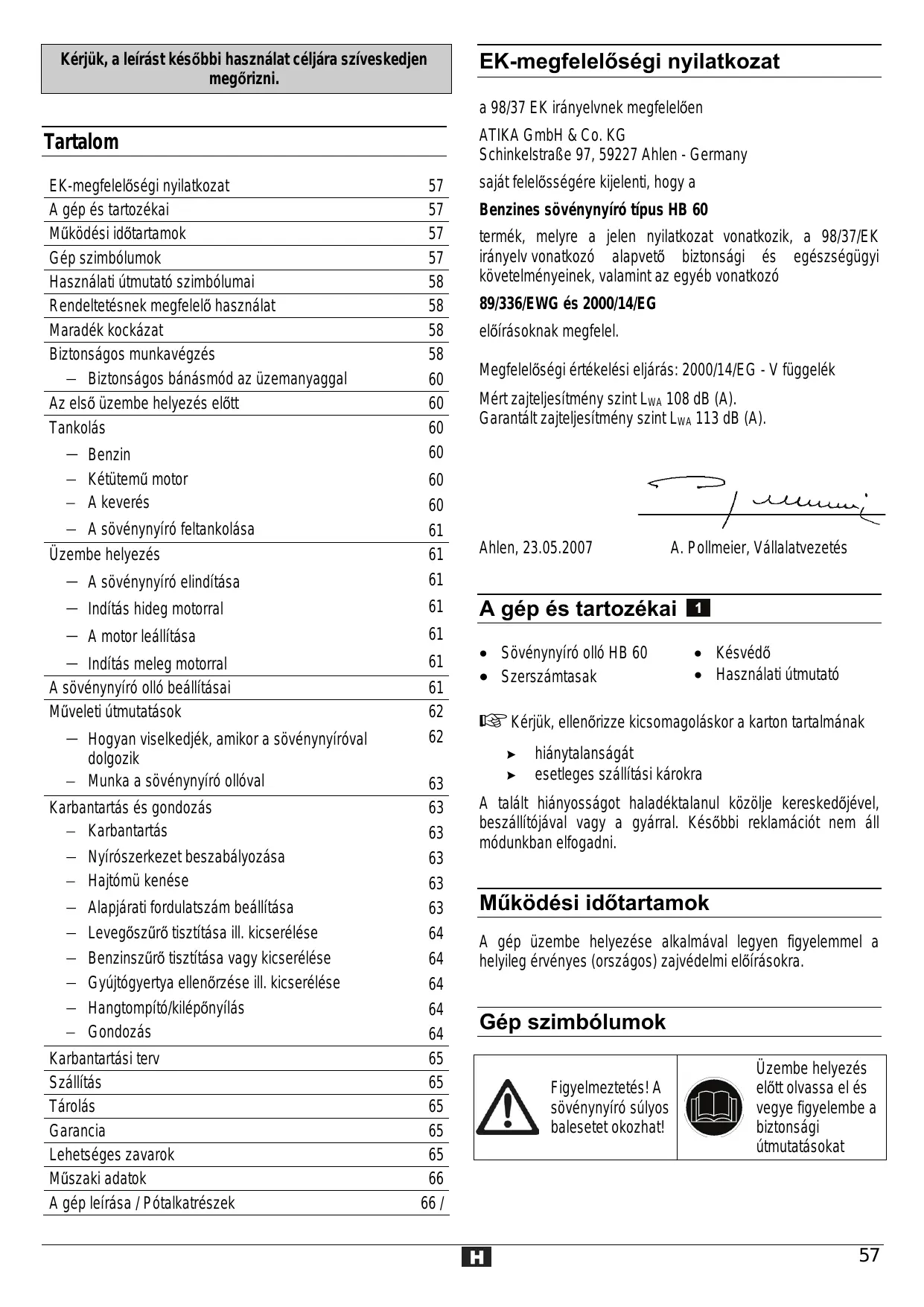 Találja meg az eszköz kézikönyvét ingyenesen HB 60 ATIKA PDF formátumban.
