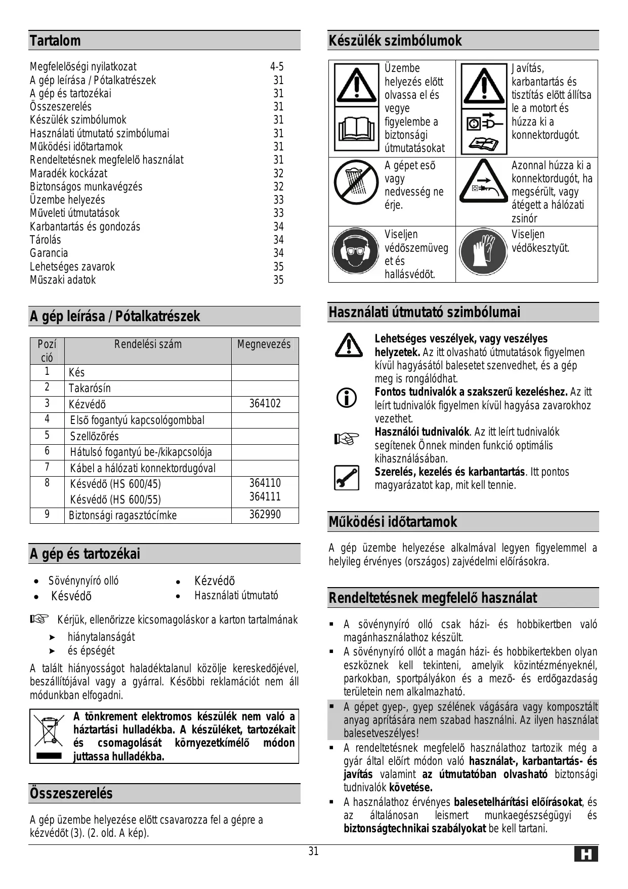 Megfelelőségi nyilatkozat A gép leírása / Pótalkatrészek A gép és tartozékai Összeszerelés Készülék szimbólumok Használati útmutató szimbólumai Működési időtartamok Rendeltetésnek megfelelő használat Maradék kockázat Biztonságos munkavégzés Üzembe helyezés Műveleti útmutatások Karbantartás és gondozás Tárolás Garancia Lehetséges zavarok Műszaki adatok