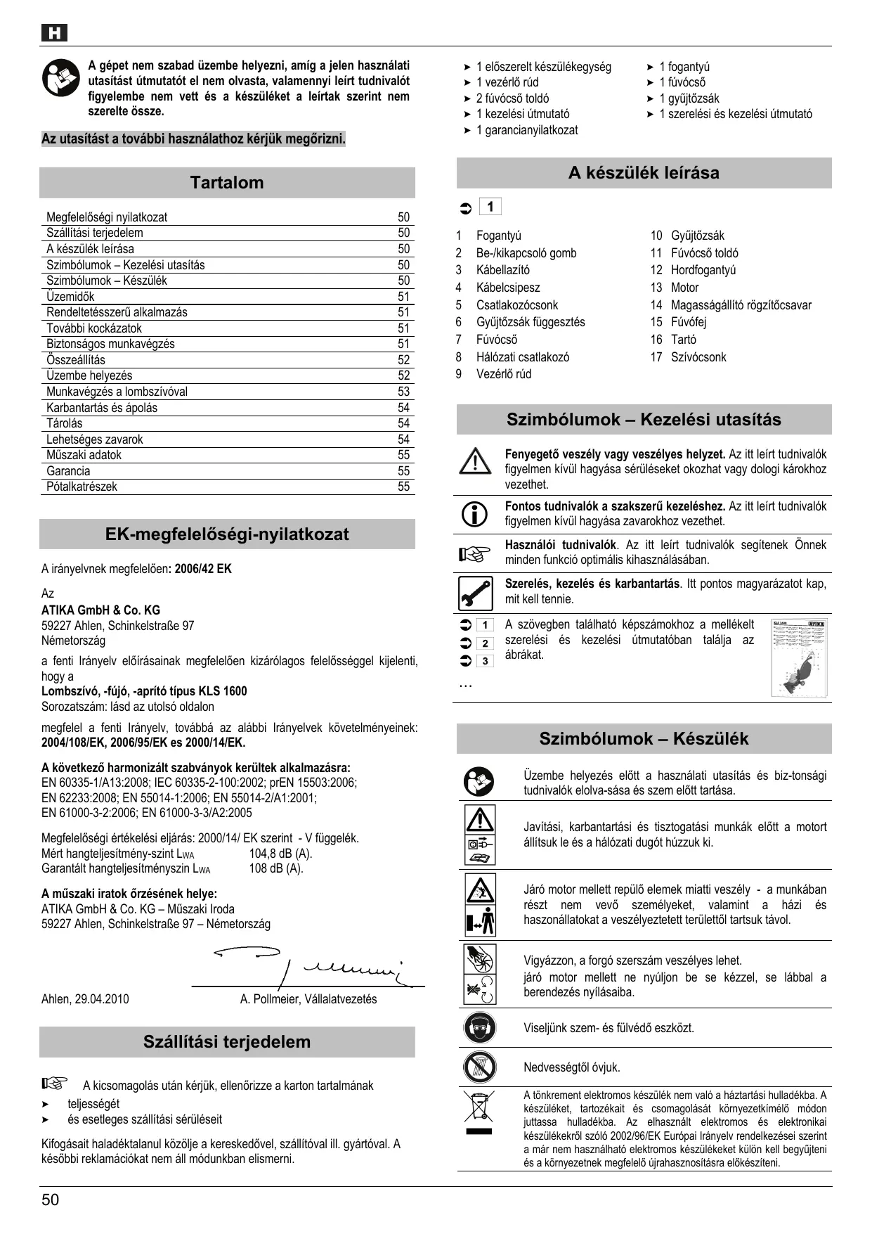 Tartalom Megfelel6ségi nyilatkozat 50 Szällitäsi terjedelem 50 A készülék leiräsa 50 Szimbélumok — Kezelési utasitäs 50 Szimbélumok — Készülék 50 Uzemidôk 51 Rendeltetésszerü alkalmazäs 51 Toväbbi kockäzatok 51 Biztonsägos munkavégzés 51 Osszeällitàs 52 Üzembe helyezés 52 Munkavégzés a lombszivoval 53 Karbantartäs és âpoläs 54 Tärolés 54 Lehetséges zavarok 54 Müszaki adatok 55 Garancia 55 Pôtalkatrészek 55