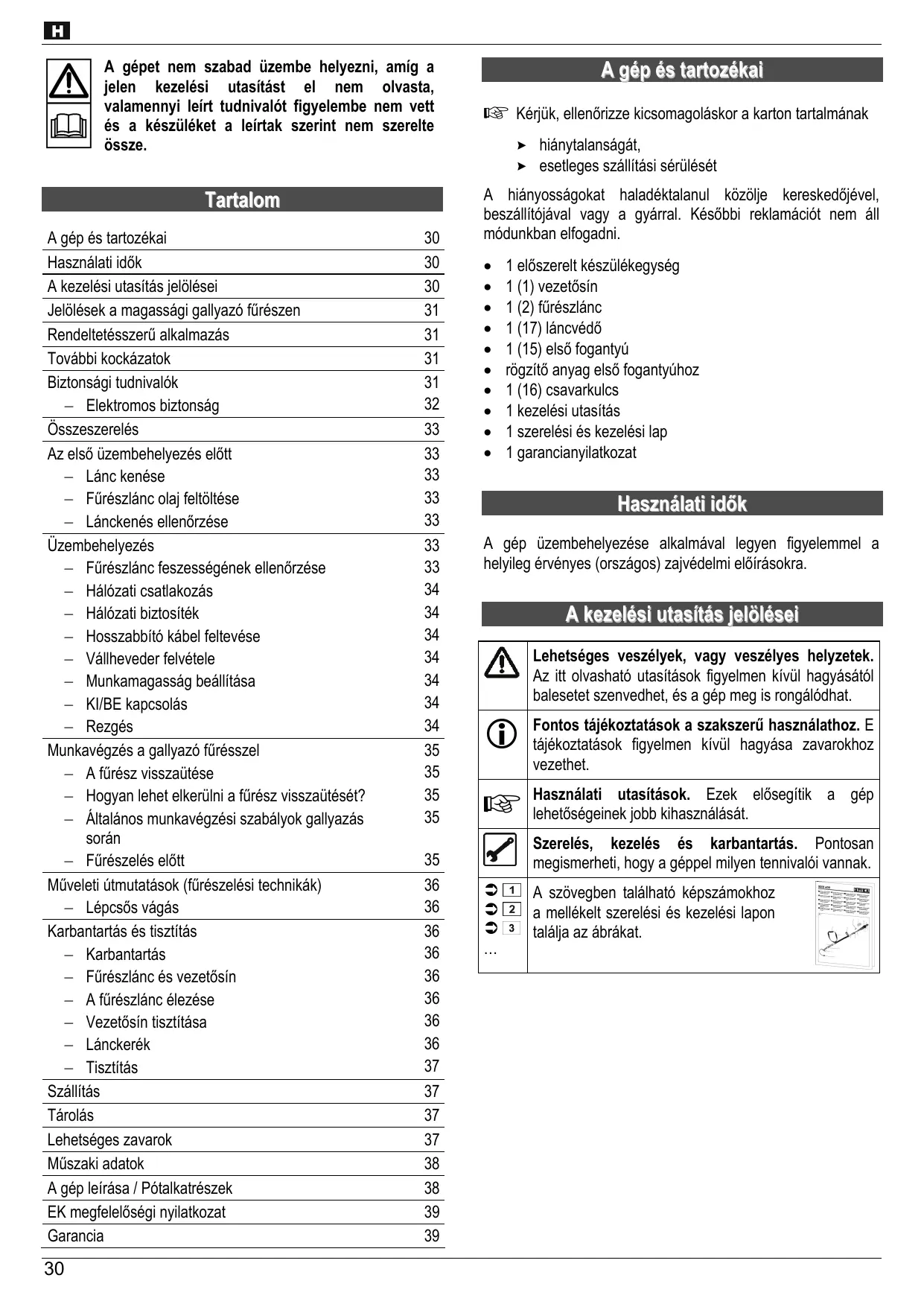 ôssze. A gép és tartozékai 30 Hasznälati idôk 30 A kezelési utasitäs jelülései 30 Jelôlések a magassägi gallyazé fürészen 31 Rendeltetésszerü alkalmazäs 31 Toväbbi kockäzatok 31 Biztonsägi tudnivalk 31 — Elektromos biztonsäg 32 Üsszeszerelés 33 Az elsé üzembehelyezés elôtt 33 — Länc kenése 33 — Fürészlänc olaj feltôltése 33 — _ Länckenés ellenôrzése 33 Üzembehelyezés 33 — Fürészlänc feszességének ellenôrzése 33 — Hälézati csatlakozäs 34 — Hälézati biztositék 34 — Hosszabbité käbel feltevése 34 — Vällheveder felvétele 34 — Munkamagassäg bedllitäsa 34 — _ KI/BE kapcsoläs 34 — Rezgés 34 Munkavégzés a gallyazé fürésszel 35 — A fürész visszaütése 35 — Hogyan lehet elkerülni a fürész visszaütését? 35 — Âltalänos munkavégzési szabälyok gallyazäs 35 sorän — Fürészelés elôtt 35 Müveleti Üütmutatäsok (fürészelési technikäk) 36 — _Léposés vâgäs 36 Karbantartäs és tisztités 36 — Karbantartés 36 — Fürészlänc és vezetésin 36 — A fürészlänc élezése 36 — Vezetésin tisztitäsa 36 — Länckerék 36 — Tisztitâs 37 Szällitäs 37 Täroläs 37 Lehetséges zavarok 37 Müszaki adatok 38 A gép leiräsa / Pôtalkatrészek 38 EK megfeleléségi nyilatkozat 39 Garancia 39