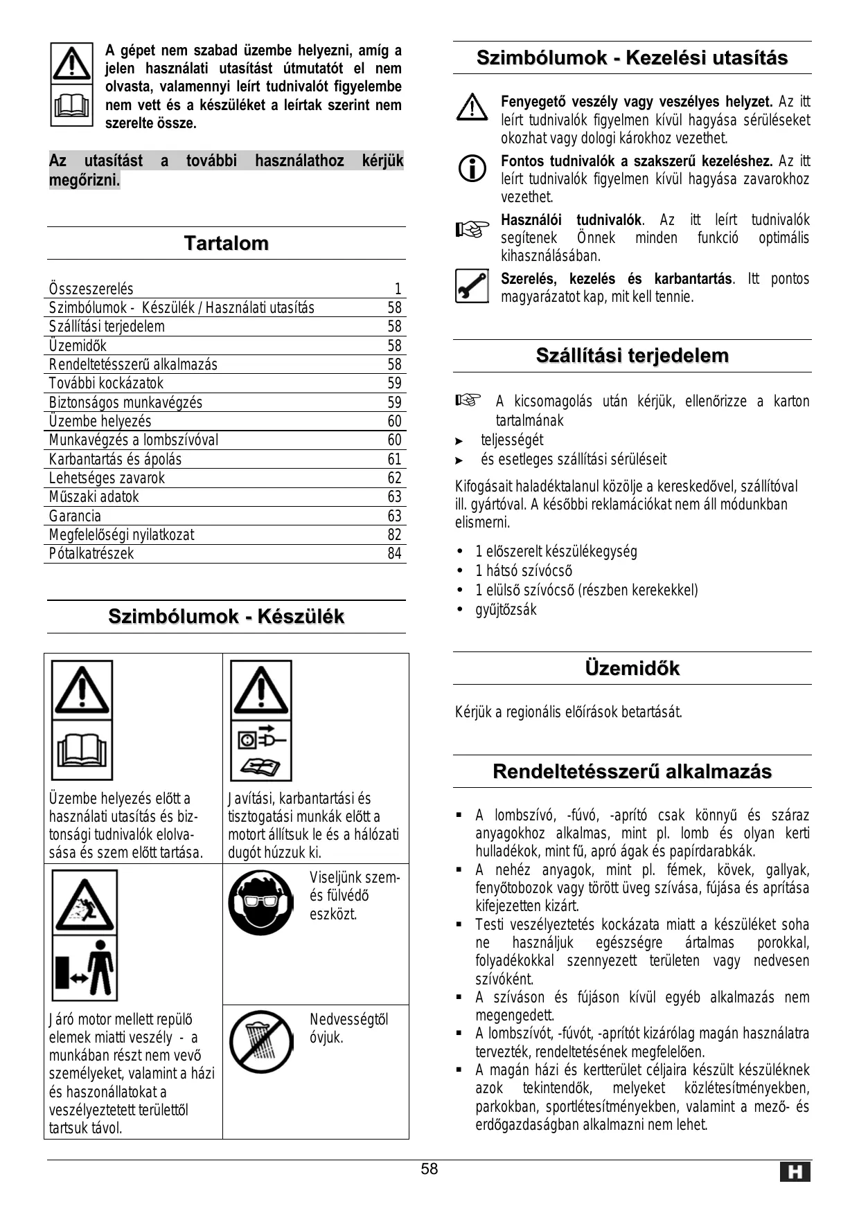 megôrizni. leirt tudnivalék figyelmen kivül hagyésa zavarokhoz vezethet. Æ Hasznälôi tudnivalék. Az it leirt tudnivalék Tartalom segitenek Onnek minden funkcié optimälis kihasznéléséban. A Szerelés, kezelés és karbantartäs. It pontos Osszeszerelés 1 V4 4 F : Szimbélumok - Készülék / Hasznélati utasités 58 magyarézatot kap, mi ll tennie. Szällitési terjedelem 58 Uzemidôk 58 PRE : Rendeltetésszerü alkalmazäs 58 Szällitäsi terjedelem Tovébbi kockézatok 59 Biztonsägos munkavégzés 59 I A kicsomagolés utén kérjük, ellenérizze a karton Uzembe helyezés 60 tartalmänak Munkavégzés a lombszivôval 60 > teljességét Karbantartäs és époläs 61 » és esetleges szällitäsi sérüléseit LEneRÈRes Lavarok g Kifogésait haladéktalanul kôzôlje a kereskedôvel, szällitéval ; ill, gyértôval. À kés6bbi reklamäciékat nem él médunkban Garancia _— 63 elismemi. Megfelel6ségi nyilatkozat 82 Pétalkatrészek 84 + _lelôszerelt készülékegység
