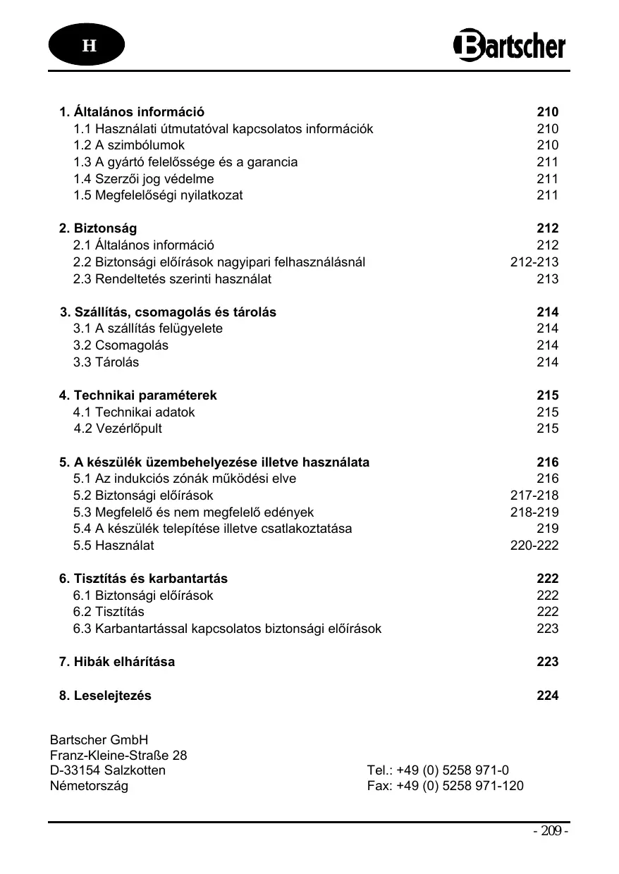 Elhasznált készülék Miután az üzemeltetése befejeződött, az elhasznált készüléket le kell selejtezni a helyi jogszabályok által meghatározott módon. E célból kérjük, lépjen kapcsolatba egy erre szakosodott céggel illetve az Önkormányzat illetékes hivatalával. FIGYELEM! Az esetlegesen előfordulható visszaélések és az általuk okozott károk elkerülése érdekében a leselejtezés előtt gondoskodni kell arról, hogy a termék használhatatlan legyen. E célból áramtalanítani kell a készüléket, elvágva a bekötőkábelt. JÓ TANÁCS! Leselejtezésnél a hatályos jogszabályoknak megfelelően kell cselekedni. Bartscher GmbH Franz-Kleine-Straße 28 D-33154 Salzkotten Németország