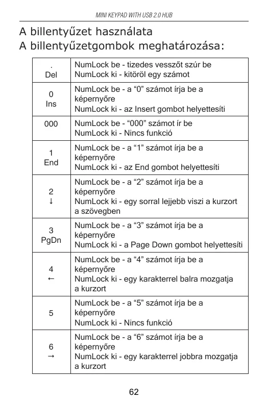 Con NumLock activado - inserta un “4” en la pantalla Con NumLock desactivado - mueve un carácter a la izquierda de la posición del cursor Con NumLock activado - inserta un “5” en la pantalla Con NumLock desactivado – No permite la función Con NumLock activado - inserta un “6” en la pantalla Con NumLock desactivado - mueve un carácter a la derecha de la posición del cursor