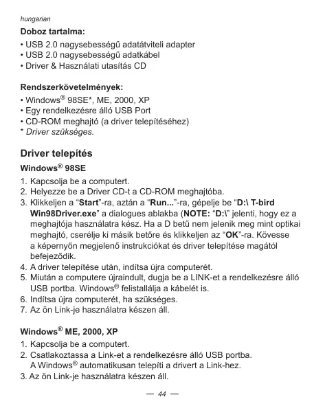 - Klikkeljen a "Start"-ra, aztán a "Run..."-ra, gépèjbe d: D:\ T-bird 3Win980Driver.exe" a dialogues ablakba (NOTE: D^l^ jelenti, hagy ez a meghajója hasznalatra kesz. Ha a D beti nem jelenik meg mint optikai meghajó, cseréljé ki másik betrö és klikkeljen az z OK"-ra. Kövesse a képernyón megeleno instrukcićkat és driver telepitése magától befejezódik.