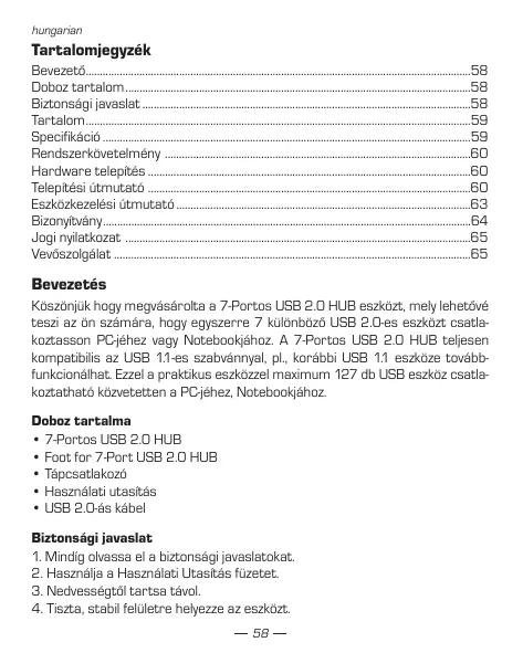 Kössönjük hagy megvársalota a 7-Portos USB 2.0 HUB esköz, mely lehtové teszi az on szamára, hogy egyszerme 7 külnböz USB 2.0-es esközzt csatá-koztasson PC-jehez vagy Notebookjahoz. A 7-Portos USB 2.0 HUB teltesen compatibilis az USB 11-es szabványal, pl, korábbi USB 1.1 esközte tovabb-funkciónhalt. Ezzel a praktikus esközzel maximum 127 db USB esközcsatá-koztathato kozvetten a PC-jehez, Notebookjahoz.