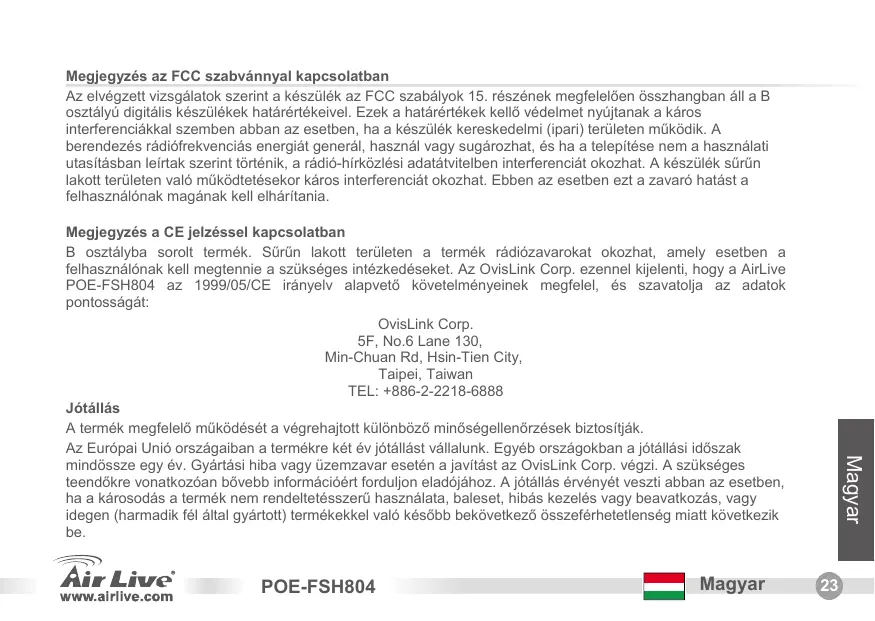 POE-FSH804 è un sistema di fornitura di energia del tipo end-span (potenza fornita 12,36 pin). Solo le porte da 1 a 4 supportano il sistema PoE. L’assorbimento totale di energia è pari a 60W; 802.3af massimi L’assorbimento totale di energia è pari a 55W (Port 1 – 4) massimi. Massima lunghezza del cavo:100 m. Non creare anelli di network (vedere il diagramma). Always Controllare continuamente lo stato dei led per verificare eventuali errori o malfunzionamenti. Italiano POE-FSH804 Megjegyzés az FCC szabvánnyal kapcsolatban Az elvégzett vizsgálatok szerint a készülék az FCC szabályok 15. részének megfelelően összhangban áll a B osztályú digitális készülékek határértékeivel. Ezek a határértékek kellő védelmet nyújtanak a káros interferenciákkal szemben abban az esetben, ha a készülék kereskedelmi (ipari) területen működik. A berendezés rádiófrekvenciás energiát generál, használ vagy sugározhat, és ha a telepítése nem a használati utasításban leírtak szerint történik, a rádió-hírközlési adatátvitelben interferenciát okozhat. A készülék sűrűn lakott területen való működtetésekor káros interferenciát okozhat. Ebben az esetben ezt a zavaró hatást a felhasználónak magának kell elhárítania. POE-FSH804 Magyar Magyar Megjegyzés a CE jelzéssel kapcsolatban B osztályba sorolt termék. Sűrűn lakott területen a termék rádiózavarokat okozhat, amely esetben a felhasználónak kell megtennie a szükséges intézkedéseket. Az OvisLink Corp. ezennel kijelenti, hogy a AirLive POE-FSH804 az 1999/05/CE irányelv alapvető követelményeinek megfelel, és szavatolja az adatok pontosságát: OvisLink Corp. 5F, No.6 Lane 130, Min-Chuan Rd, Hsin-Tien City, Taipei, Taiwan