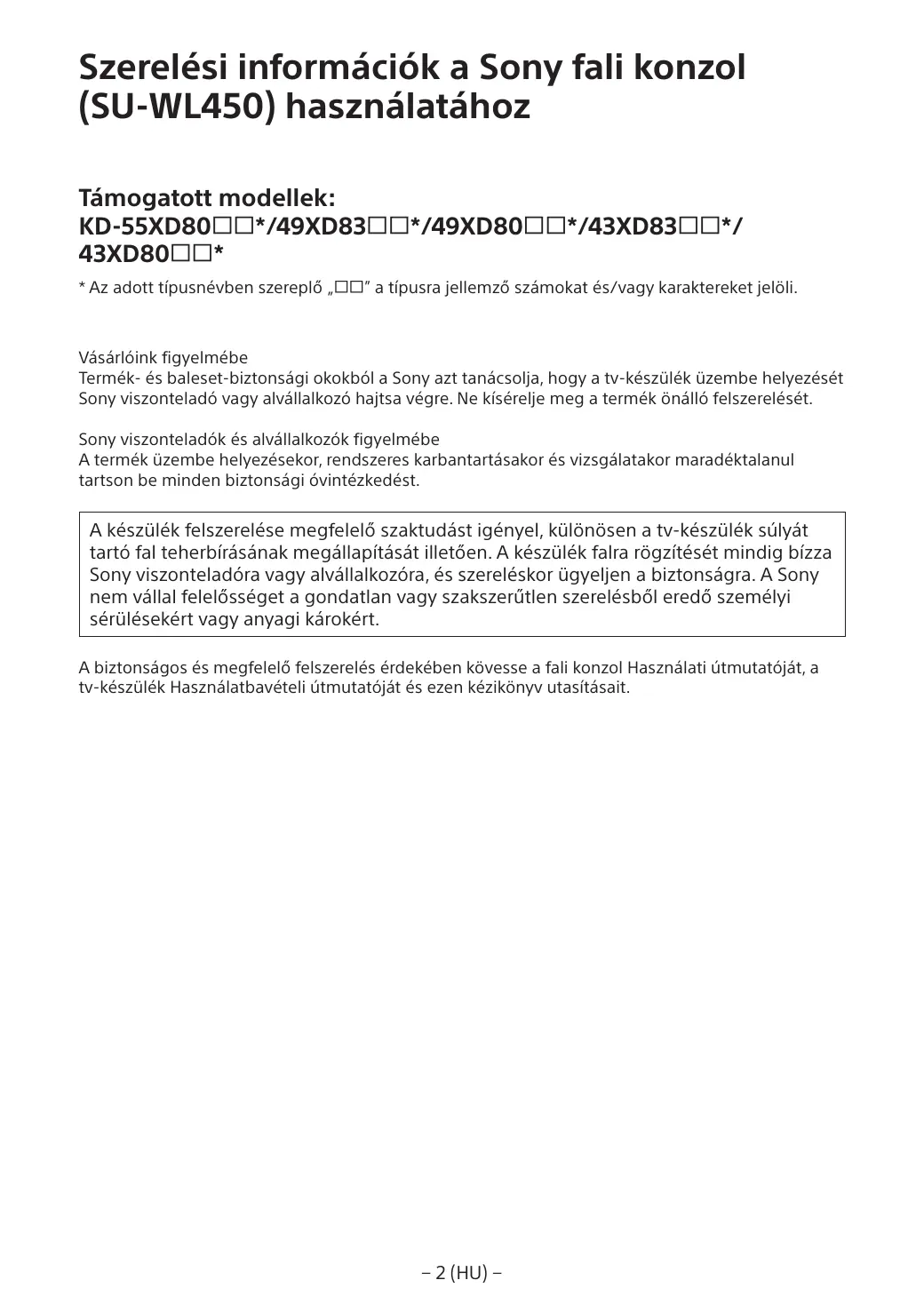 Szerelési információk a Sony fali konzol (SU-WL450) használatához Támogatott modellek: KD-55XD80*/49XD83*/49XD80*/43XD83*/ 43XD80* * Az adott típusnévben szereplő „” a típusra jellemző számokat és/vagy karaktereket jelöli.