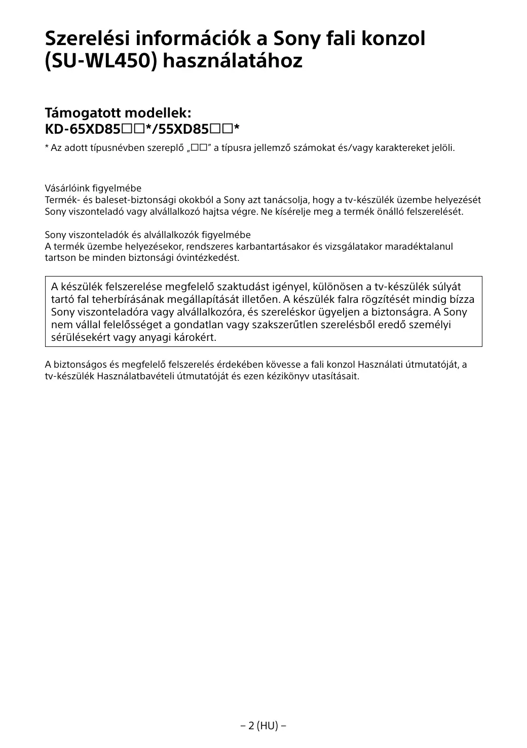 Szerelési információk a Sony fali konzol (SU-WL450) használatához Támogatott modellek: KD-65XD85*/55XD85* * Az adott típusnévben szereplő „” a típusra jellemző számokat és/vagy karaktereket jelöli.