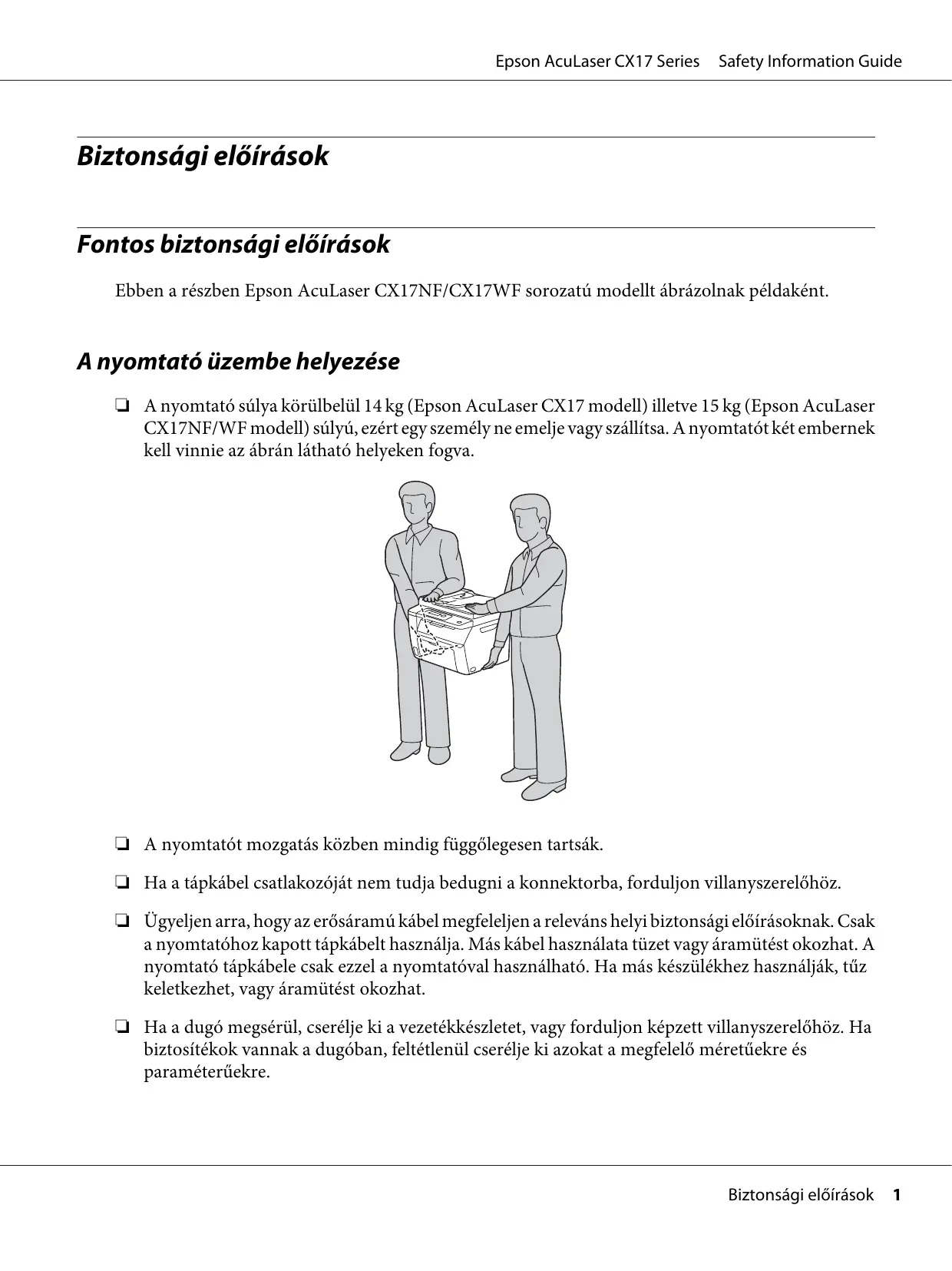 D A nyomtaté sûlya kôrülbelül 14 kg (Epson AcuLaser CX17 model) illetve 15 kg (Epson AcuLaser CX17NF/WF modell) sülyü, ezért egy személy ne emelje vagy szällitsa. À nyomtatét kétembernek kell vinnie az äbrän lâthaté helyeken fogva.