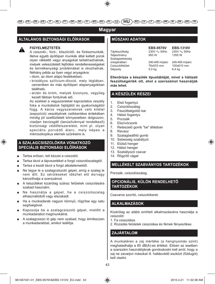 HASZNÁLATI ÚTMUTATÓ EBS9576VFHG RYOBI