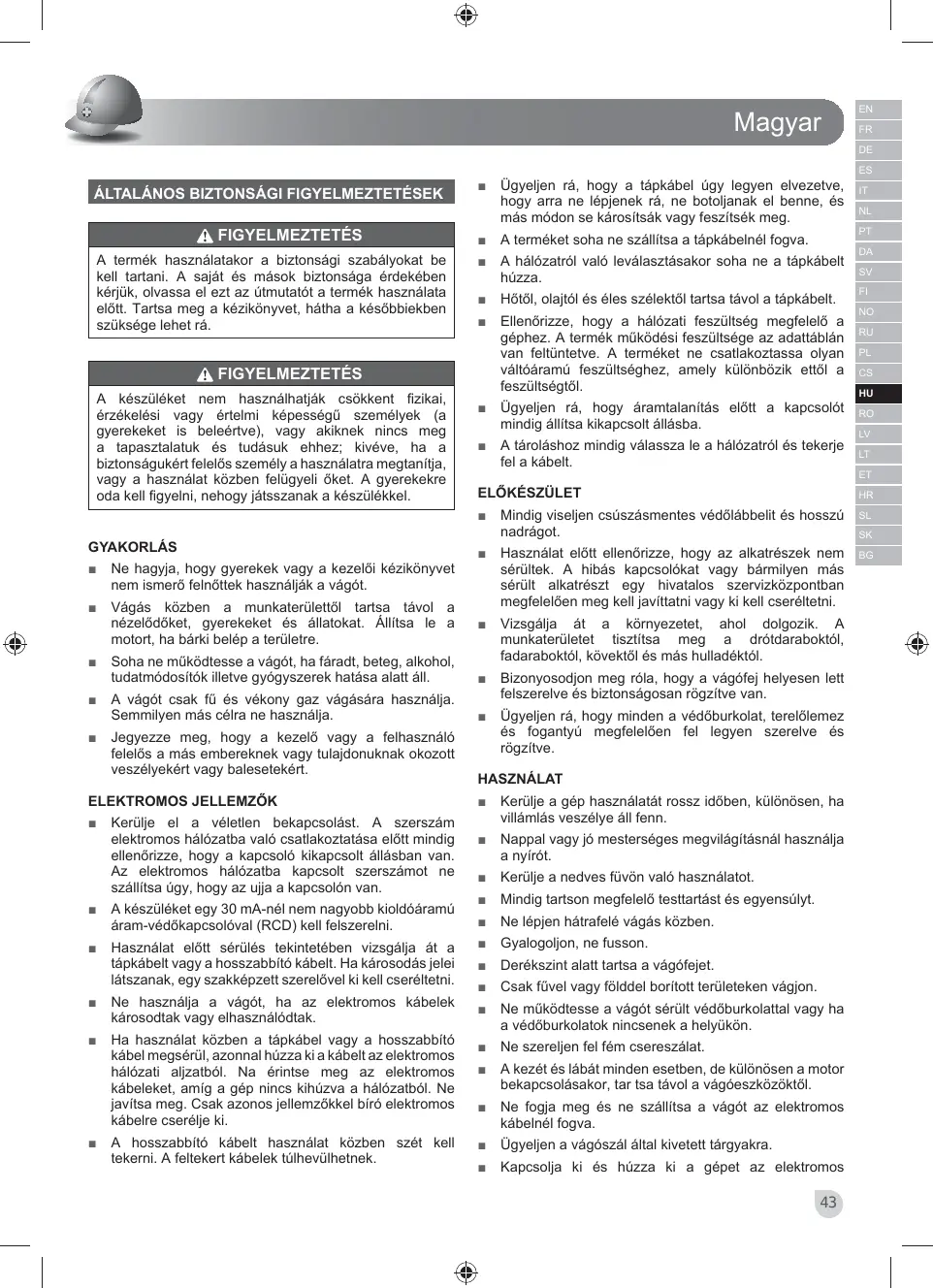 Feszültség Viseljen szem- és fülvédőt. Kerülje a gép használatát nedves vagy vizes körülmények között. A nézelődő személyek legyenek legalább 15 méteres távolságban. Karbantartás előtt vagy sérülése, illetve átvágása esetén azonnal húzza ki a tápkábelt az elektromos hálózatból. Figyeljen a kivetett vagy repülő tárgyakra. A nézelődőket a géptől biztonságos távolságban tartsa. Használaton kívül a szerszámgépeket száraz, hűvös helyen, gyerekektől elzárva kell tárolni. Ne tárolja a szabadban.