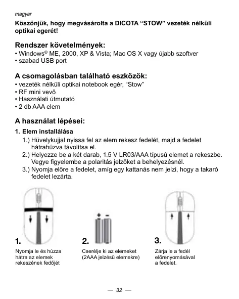1.) Hévelykujnal nyissa fel az elem rekesz fedelet, majd a fedelet hārathužva távolitsa il.