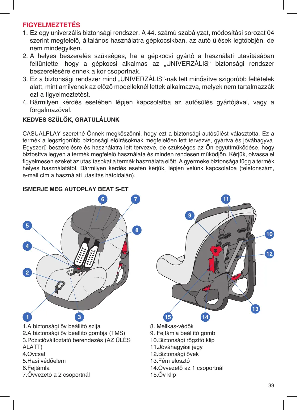 CASUALPLAY szeretné Önnek megköszönni, hogy ezt a biztonsági autósülést választotta. Ez a termék a legszigorúbb biztonsági előírásoknak megfelelően lett tervezve, gyártva és jóváhagyva. Egyszerű beszerelésre és használatra lett tervezve, de szükséges az Ön együttműködése, hogy biztosítva legyen a termék megfelelő használata és minden rendesen működjön. Kérjük, olvassa el figyelmesen ezeket az utasításokat a termék használata előtt. A gyermeke biztonsága függ a termék helyes használatától. Bármilyen kérdés esetén kérjük, lépjen velünk kapcsolatba (telefonszám, e-mail cím a használati utasítás hátoldalán). ISMERJE MEG AUTOPLAY BEAT S-et 1.A biztonsági öv beállító szíja 2.A biztonsági öv beállító gombja (TMS) 3.Pozícióváltoztató berendezés (AZ ÜLÉS ALATT) 4.Övcsat 5.Hasi védőelem 6.Fejtámla 7.Övvezető a 2 csoportnál