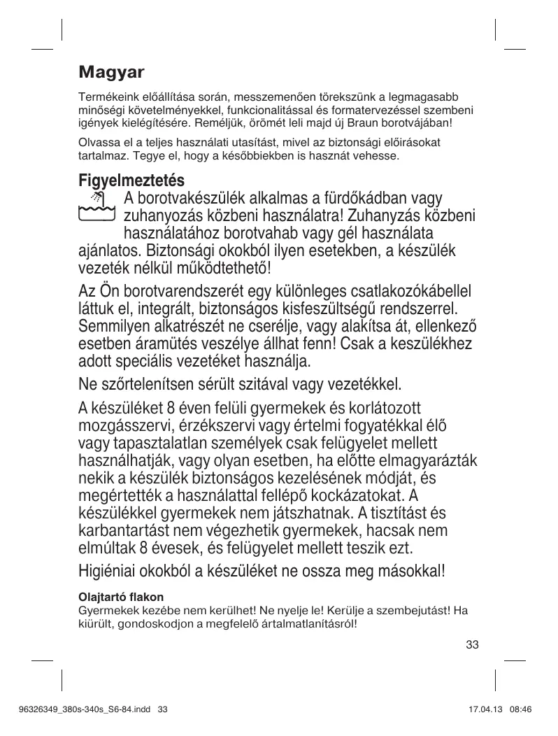 Magyar Termékeink előállítása során, messzemenően törekszünk a legmagasabb minőségi követelményekkel, funkcionalitással és formatervezéssel szembeni igények kielégítésére. Reméljük, örömét leli majd új Braun borotvájában! Olvassa el a teljes használati utasítást, mivel az biztonsági előirásokat tartalmaz. Tegye el, hogy a későbbiekben is hasznát vehesse. Figyelmeztetés A borotvakészülék alkalmas a fürdőkádban vagy zuhanyozás közbeni használatra! Zuhanyzás közbeni használatához borotvahab vagy gél használata ajánlatos. Biztonsági okokból ilyen esetekben, a készülék vezeték nélkül működtethető! Az Ön borotvarendszerét egy különleges csatlakozókábellel láttuk el, integrált, biztonságos kisfeszültségű rendszerrel. Semmilyen alkatrészét ne cserélje, vagy alakítsa át, ellenkező esetben áramütés veszélye állhat fenn! Csak a keszülékhez adott speciális vezetéket használja. Ne szőrtelenítsen sérült szitával vagy vezetékkel. A készüléket 8 éven felüli gyermekek és korlátozott mozgásszervi, érzékszervi vagy értelmi fogyatékkal élő vagy tapasztalatlan személyek csak felügyelet mellett használhatják, vagy olyan esetben, ha előtte elmagyarázták nekik a készülék biztonságos kezelésének módját, és megértették a használattal fellépő kockázatokat. A készülékkel gyermekek nem játszhatnak. A tisztítást és karbantartást nem végezhetik gyermekek, hacsak nem elmúltak 8 évesek, és felügyelet mellett teszik ezt. Higiéniai okokból a készüléket ne ossza meg másokkal! Olajtartó flakon Gyermekek kezébe nem kerülhet! Ne nyelje le! Kerülje a szembejutást! Ha kiürült, gondoskodjon a megfelelő ártalmatlanításról!