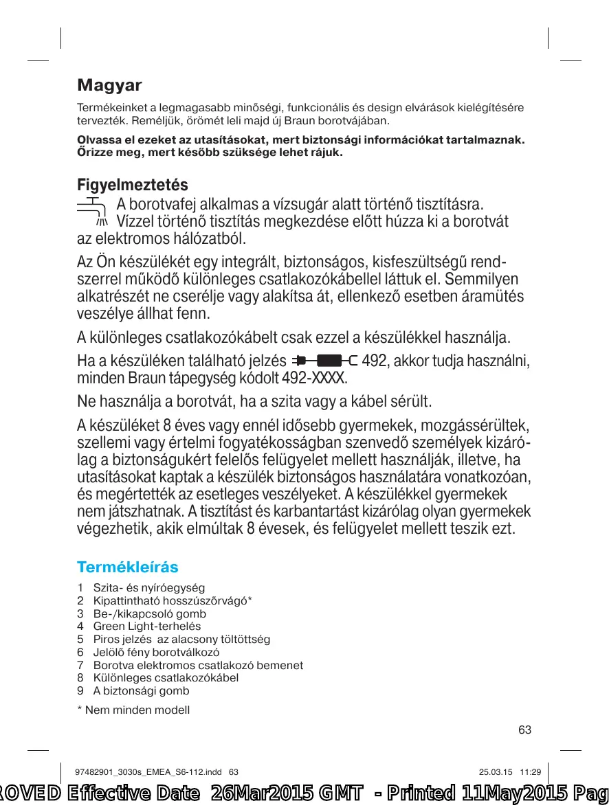 Figyelmeztetés A borotvafej alkalmas a vízsugár alatt történő tisztításra. Vízzel történő tisztítás megkezdése előtt húzza ki a borotvát az elektromos hálózatból. Az Ön készülékét egy integrált, biztonságos, kisfeszültségű rendszerrel működő különleges csatlakozókábellel láttuk el. Semmilyen alkatrészét ne cserélje vagy alakítsa át, ellenkező esetben áramütés veszélye állhat fenn. A különleges csatlakozókábelt csak ezzel a készülékkel használja. Ha a készüléken található jelzés 492, akkor tudja használni, minden Braun tápegység kódolt 492-XXXX. Ne használja a borotvát, ha a szita vagy a kábel sérült. A készüléket 8 éves vagy ennél idősebb gyermekek, mozgássérültek, szellemi vagy értelmi fogyatékosságban szenvedő személyek kizárólag a biztonságukért felelős felügyelet mellett használják, illetve, ha utasításokat kaptak a készülék biztonságos használatára vonatkozóan, és megértették az esetleges veszélyeket. A készülékkel gyermekek nem játszhatnak. A tisztítást és karbantartást kizárólag olyan gyermekek végezhetik, akik elmúltak 8 évesek, és felügyelet mellett teszik ezt. Termékleírás 1 2 3 4 5 6 7 8 9