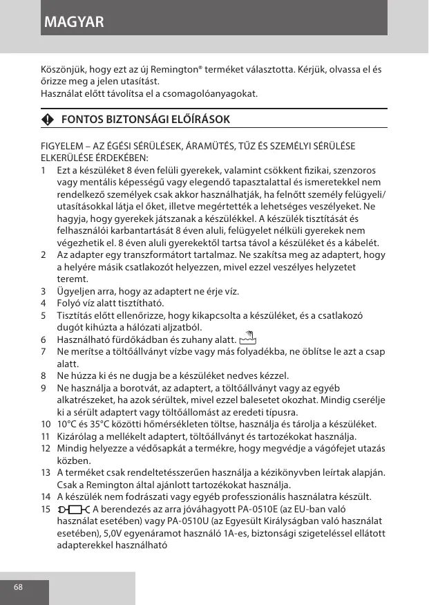 MAGYAR Köszönjük, hogy ezt az új Remington® terméket választotta. Kérjük, olvassa el és őrizze meg a jelen utasítást. Használat előtt távolítsa el a csomagolóanyagokat. F FONTOS BIZTONSÁGI ELŐÍRÁSOK FIGYELEM – AZ ÉGÉSI SÉRÜLÉSEK, ÁRAMÜTÉS, TŰZ ÉS SZEMÉLYI SÉRÜLÉSE ELKERÜLÉSE ÉRDEKÉBEN: 1 Ezt a készüléket 8 éven felüli gyerekek, valamint csökkent fizikai, szenzoros vagy mentális képességű vagy elegendő tapasztalattal és ismeretekkel nem rendelkező személyek csak akkor használhatják, ha felnőtt személy felügyeli/ utasításokkal látja el őket, illetve megértették a lehetséges veszélyeket. Ne hagyja, hogy gyerekek játszanak a készülékkel. A készülék tisztítását és felhasználói karbantartását 8 éven aluli, felügyelet nélküli gyerekek nem végezhetik el. 8 éven aluli gyerekektől tartsa távol a készüléket és a kábelét. 2 Az adapter egy transzformátort tartalmaz. Ne szakítsa meg az adaptert, hogy a helyére másik csatlakozót helyezzen, mivel ezzel veszélyes helyzetet teremt. 3 Ügyeljen arra, hogy az adaptert ne érje víz. 4 Folyó víz alatt tisztítható. 5 Tisztítás előtt ellenőrizze, hogy kikapcsolta a készüléket, és a csatlakozó dugót kihúzta a hálózati aljzatból. 6 Használható fürdőkádban és zuhany alatt. 7 Ne merítse a töltőállványt vízbe vagy más folyadékba, ne öblítse le azt a csap alatt. 8 Ne húzza ki és ne dugja be a készüléket nedves kézzel. 9 Ne használja a borotvát, az adaptert, a töltőállványt vagy az egyéb alkatrészeket, ha azok sérültek, mivel ezzel balesetet okozhat. Mindig cserélje ki a sérült adaptert vagy töltőállomást az eredeti típusra. 10 10°C és 35°C közötti hőmérsékleten töltse, használja és tárolja a készüléket. 11 Kizárólag a mellékelt adaptert, töltőállványt és tartozékokat használja. 12 Mindig helyezze a védősapkát a termékre, hogy megvédje a vágófejet utazás közben. 13 A terméket csak rendeltetésszerűen használja a kézikönyvben leírtak alapján. Csak a Remington által ajánlott tartozékokat használja. 14 A készülék nem fodrászati vagy egyéb professzionális használatra készült. A berendezés az arra jóváhagyott PA-0510E (az EU-ban való használat esetében) vagy PA-0510U (az Egyesült Királyságban való használat esetében), 5,0V egyenáramot használó 1A-es, biztonsági szigeteléssel ellátott adapterekkel használható