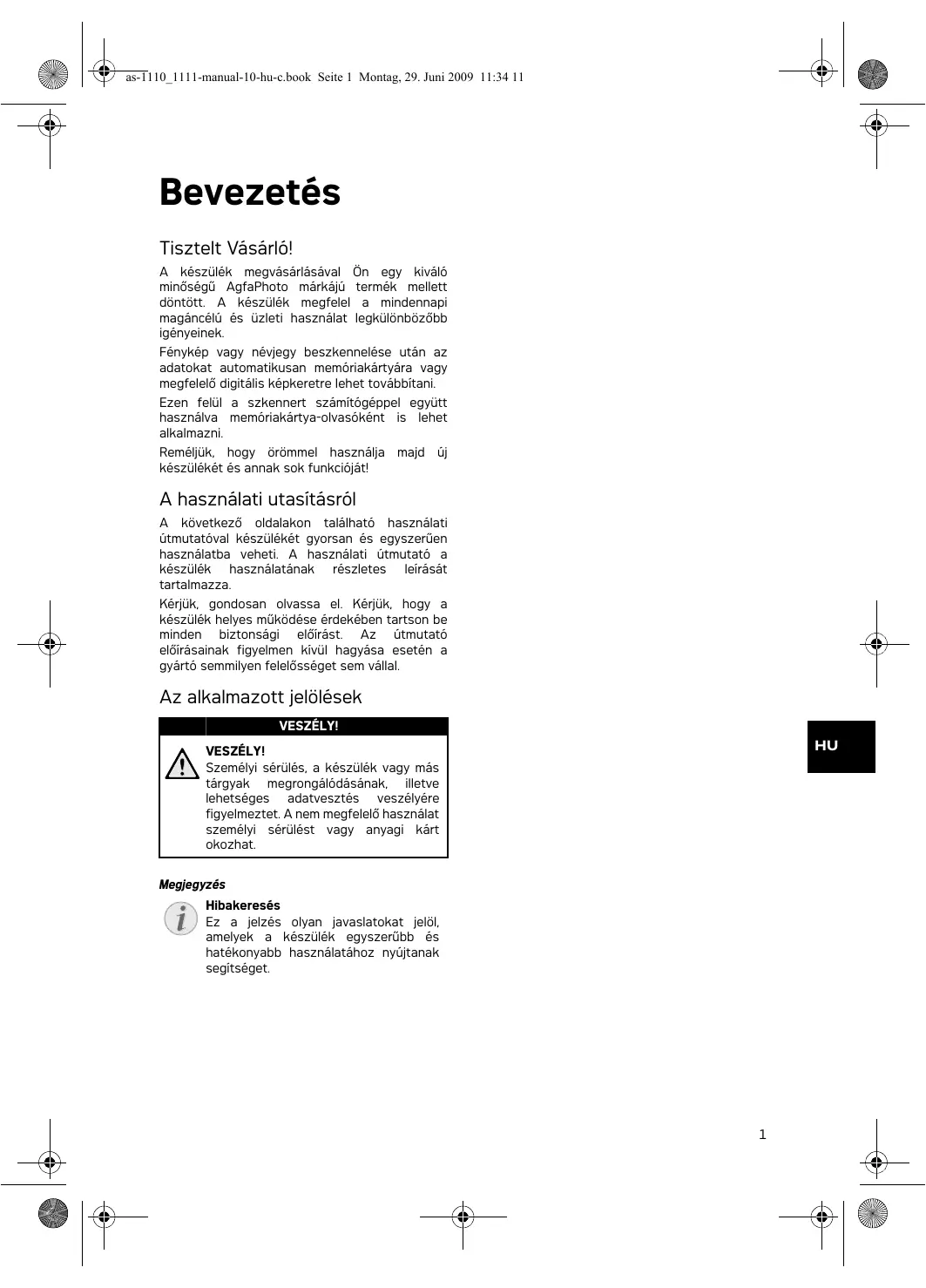 as-1110_1111-manual-10-hu-c.book Seite 1 Montag, 29. Juni 2009 11:34 11 Bevezetés Tisztelt Vásárló! Bevezetés Brand Variabel A készülék megvásárlásával Ön egy kiváló minőségű AgfaPhoto márkájú termék mellett döntött. A készülék megfelel a mindennapi magáncélú és üzleti használat legkülönbözőbb igényeinek. Fénykép vagy névjegy beszkennelése után az adatokat automatikusan memóriakártyára vagy megfelelő digitális képkeretre lehet továbbítani. Ezen felül a szkennert számítógéppel együtt használva memóriakártya-olvasóként is lehet alkalmazni. Reméljük, hogy örömmel használja majd új készülékét és annak sok funkcióját! A használati utasításról A következő oldalakon található használati útmutatóval készülékét gyorsan és egyszerűen használatba veheti. A használati útmutató a készülék használatának részletes leírását tartalmazza. Kérjük, gondosan olvassa el. Kérjük, hogy a készülék helyes működése érdekében tartson be minden biztonsági előírást. Az útmutató előírásainak figyelmen kívül hagyása esetén a gyártó semmilyen felelősséget sem vállal. Az alkalmazott jelölések Veszély VESZÉLY!