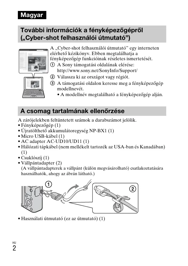Magyar További információk a fényképezőgépről („Cyber-shot felhasználói útmutató”) A „Cyber-shot felhasználói útmutató” egy interneten elérhető kézikönyv. Ebben megtalálhatja a fényképezőgép funkcióinak részletes ismertetését. 1 A Sony támogatási oldalának elérése: http://www.sony.net/SonyInfo/Support/ 2 Válassza ki az országot vagy régiót. 3 A támogatási oldalon keresse meg a fényképezőgép modellnevét.