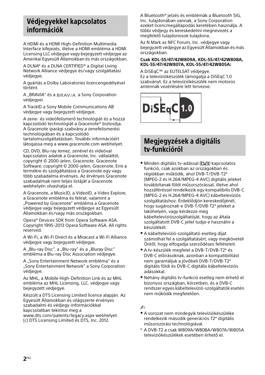 Védjegyekkel kapcsolatos információk A HDMI és a HDMI High-Definition Multimedia Interface kifejezés, illetve a HDMI embléma a HDMI Licensing LLC védjegye vagy bejegyzett védjegye az Amerikai Egyesült Államokban és más országokban. A DLNA® és a DLNA CERTIFIED® a Digital Living Network Alliance védjegye és/vagy szolgáltatási védjegye. A gyártás a Dolby Laboratories licencengedélyével történt. A „BRAVIA” és a védjegyei. A Bluetooth® jelzés és emblémák a Bluetooth SIG, Inc. tulajdonában vannak, a Sony Corporation ezeket licencmegállapodás keretében használja. A többi védjegy és kereskedelmi megnevezés a megfelelő tulajdonosok tulajdona. Az N Mark az NFC Forum, Inc. védjegye vagy bejegyzett védjegye az Egyesült Államokban és más országokban. Csak KDL-55/47/42W809A, KDL-55/47/42W808A, KDL-55/47/42W807A, KDL-55/47/42W805A: A DiSEqC™ az EUTELSAT védjegye. Ez a televíziókészülék támogatja a DiSEqC 1.0 szabványt. Ez a televíziókészülék nem motoros antennák vezérlésére lett tervezve. a Sony Corporation A TrackID a Sony Mobile Communications AB védjegye vagy bejegyzett védjegye. A zene- és videófelismerő technológiát és a hozzá kapcsolódó technológiát a Gracenote® biztosítja. A Gracenote iparági szabvány a zenefelismerési technológiában és a kapcsolódó tartalomszolgáltatásban. További információért látogassa meg a www.gracenote.com webhelyet. CD, DVD, Blu-ray lemez, zenével és videóval kapcsolatos adatok a Gracenote, Inc. vállalattól, copyright © 2000-jelen, Gracenote. Gracenote Software, copyright © 2000-jelen, Gracenote. Erre a termékre és szolgáltatásra a Gracenote egy vagy több szabadalma érvényes. Az érvényes Gracenote szabadalmak nem teljes listáját a Gracenote webhelyén olvashatja el. A Gracenote, a MusicID, a VideoID, a Video Explore, a Gracenote embléma és felirat, valamint a „Powered by Gracenote” embléma a Gracenote védjegye vagy bejegyzett védjegye az Egyesült Államokban és/vagy más országokban. Opera® Devices SDK from Opera Software ASA. Copyright 1995-2013 Opera Software ASA. All rights reserved. A Wi-Fi, a Wi-Fi Direct és a Miracast a Wi-Fi Alliance védjegye vagy bejegyzett védjegye. A „Blu-ray Disc”, a „Blu-ray” és a „Bluray Disc” embléma a Blu-ray Disc Association védjegye. A „Sony Entertainment Network embléma” és a „Sony Entertainment Network” a Sony Corporation védjegye. Az MHL, a Mobile High-Definition Link és az MHL embléma az MHL Licensing, LLC. védjegye vagy bejegyzett védjegye. Készült a DTS Licensing Limited licence alapján. Az Egyesült Államokban és világszerte érvényes szabadalmi és védjegy-információkkal kapcsolatban tekintse meg a www.dts.com/patents/legacy.aspx webhelyet. (c) DTS Licensing Limited és DTS, Inc. 2012. 2HU Megjegyzések a digitális tv-funkcióról Minden digitális tv-adással ( ) kapcsolatos funkció, csak azokban az országokban és régiókban működik, ahol DVB-T/DVB-T2* (MPEG-2 és H.264/MPEG-4 AVC) digitális jeleket továbbítanak földi műsorszórással, illetve ahol hozzáféréssel rendelkezik egy kompatibilis DVB-C (MPEG-2 és H.264/MPEG-4 AVC) kábeltelevíziós szolgáltatáshoz. Érdeklődjön kereskedőjénél, hogy sugároznak-e DVB-T/DVB-T2* jeleket a lakóhelyén, vagy kérdezze meg kábeltelevíziószolgáltatóját, hogy az általa szolgáltatott DVB-C jellel tudja-e használni a készülékét. A kábeltelevízió-szolgáltató esetleg díjat számolhat fel a szolgáltatásért, vagy megköveteli Öntől, hogy elfogadja szerződéses feltételeit. A tv-készülék megfelel a DVB-T/DVB-T2* és DVB-C előírásoknak, azonban a kompatibilitást nem garantáljuk a jövőbeli DVB-T/DVB-T2* digitális földi és DVB-C digitális kábeltelevíziós adásokkal. Néhány digitális tv-funkció esetleg nem érhető el bizonyos országban, körzetben, és a DVB-C rendszer egyes kábeltelevízió-szolgáltatók esetén nem működik megfelelően. A sorozat nem mindegyik televíziókészüléke rendelkezik második generációs T2* digitális műsorszórási technológiával.