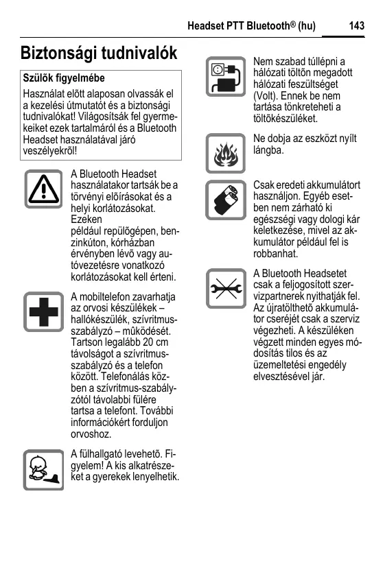 Headset PTT Bluetooth® (hu) Biztonsági tudnivalók oth® Szülõk figyelmébe Használat elõtt alaposan olvassák el a kezelési útmutatót és a biztonsági tudnivalókat! Világosítsák fel gyermekeiket ezek tartalmáról és a Bluetooth Headset használatával járó veszélyekrõl! A Bluetooth Headset használatakor tartsák be a törvényi elõírásokat és a helyi korlátozásokat. Ezeken például repülõgépen, benzinkúton, kórházban érvényben lévõ vagy autóvezetésre vonatkozó korlátozásokat kell érteni. A mobiltelefon zavarhatja az orvosi készülékek – hallókészülék, szívritmusszabályzó – mûködését. Tartson legalább 20 cm távolságot a szívritmusszabályzó és a telefon között. Telefonálás közben a szívritmus-szabályzótól távolabbi fülére tartsa a telefont. További információkért forduljon orvoshoz. A fülhallgató levehetõ. Figyelem! A kis alkatrészeket a gyerekek lenyelhetik.