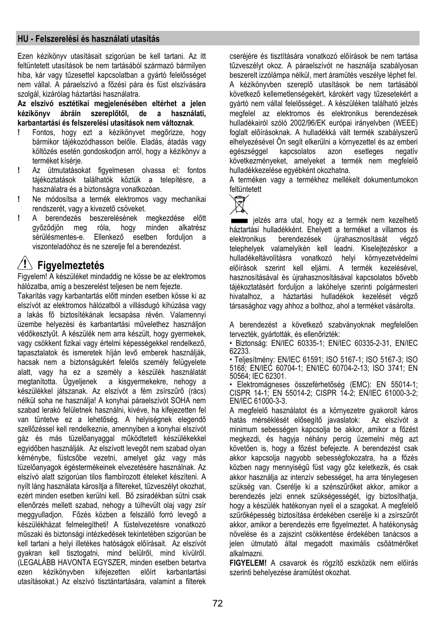 HU - Felszerelési és használati utasítás cseréjére és tisztítására vonatkozó előírások be nem tartása tűzveszélyt okoz. A páraelszívót ne használja szabályosan beszerelt izzólámpa nélkül, mert áramütés veszélye léphet fel. A kézikönyvben szereplő utasítások be nem tartásából következő kellemetlenségekért, károkért vagy tűzesetekért a gyártó nem vállal felelősséget.. A készüléken található jelzés megfelel az elektromos és elektronikus berendezések hulladékairól szóló 2002/96/EK európai irányelvben (WEEE) foglalt előírásoknak. A hulladékká vált termék szabályszerű elhelyezésével Ön segít elkerülni a környezettel és az emberi egészséggel kapcsolatos azon esetleges negatív következményeket, amelyeket a termék nem megfelelő hulladékkezelése egyébként okozhatna. A terméken vagy a termékhez mellékelt dokumentumokon feltüntetett Ezen kézikönyv utasításait szigorúan be kell tartani. Az itt feltüntetett utasítások be nem tartásából származó bármilyen hiba, kár vagy tűzesettel kapcsolatban a gyártó felelősséget nem vállal. A páraelszívó a főzési pára és füst elszívására szolgál, kizárólag háztartási használatra. Az elszívó esztétikai megjelenésében eltérhet a jelen kézikönyv ábráin szereplőtől, de a használati, karbantartási és felszerelési utasítások nem változnak. Fontos, hogy ezt a kézikönyvet megőrizze, hogy bármikor tájékozódhasson belőle. Eladás, átadás vagy költözés esetén gondoskodjon arról, hogy a kézikönyv a terméket kísérje. Az útmutatásokat figyelmesen olvassa el: fontos tájékoztatások találhatók köztük a telepítésre, a használatra és a biztonságra vonatkozóan. Ne módosítsa a termék elektromos vagy mechanikai rendszerét, vagy a kivezető csöveket. A berendezés beszerelésének megkezdése előtt győződjön meg róla, hogy minden alkatrész sérülésmentes-e. Ellenkező esetben forduljon a viszonteladóhoz és ne szerelje fel a berendezést. jelzés arra utal, hogy ez a termék nem kezelhető háztartási hulladékként. Ehelyett a terméket a villamos és elektronikus berendezések újrahasznosítását végző telephelyek valamelyikén kell leadni. Kiselejtezéskor a hulladékeltávolításra vonatkozó helyi környezetvédelmi előírások szerint kell eljárni. A termék kezelésével, hasznosításával és újrahasznosításával kapcsolatos bővebb tájékoztatásért forduljon a lakóhelye szerinti polgármesteri hivatalhoz, a háztartási hulladékok kezelését végző társasághoz vagy ahhoz a bolthoz, ahol a terméket vásárolta. Figyelmeztetés Figyelem! A készüléket mindaddig ne kösse be az elektromos hálózatba, amíg a beszerelést teljesen be nem fejezte. Takarítás vagy karbantartás előtt minden esetben kösse ki az elszívót az elektromos hálózatból a villásdugó kihúzása vagy a lakás fő biztosítékának lecsapása révén. Valamennyi üzembe helyezési és karbantartási művelethez használjon védőkesztyűt. A készülék nem arra készült, hogy gyermekek, vagy csökkent fizikai vagy értelmi képességekkel rendelkező, tapasztalatok és ismeretek híján levő emberek használják, hacsak nem a biztonságukért felelős személy felügyelete alatt, vagy ha ez a személy a készülék használatát megtanította. Ügyeljenek a kisgyermekekre, nehogy a készülékkel játszanak. Az elszívót a fém zsírszűrő (rács) nélkül soha ne használja! A konyhai páraelszívót SOHA nem szabad lerakó felületnek használni, kivéve, ha kifejezetten fel van tüntetve ez a lehetőség. A helyiségnek elegendő szellőzéssel kell rendelkeznie, amennyiben a konyhai elszívót gáz és más tüzelőanyaggal működtetett készülékekkel egyidőben használják. Az elszívott levegőt nem szabad olyan kéménybe, füstcsőbe vezetni, amelyet gáz vagy más tüzelőanyagok égéstermékeinek elvezetésére használnak. Az elszívó alatt szigorúan tilos flambírozott ételeket készíteni. A nyílt láng használata károsítja a filtereket, tűzveszélyt okozhat, ezért minden esetben kerülni kell. Bő zsiradékban sütni csak ellenőrzés mellett szabad, nehogy a túlhevült olaj vagy zsír meggyulladjon. Főzés közben a felszálló forró levegő a készülékházat felmelegítheti! A füstelvezetésre vonatkozó műszaki és biztonsági intézkedések tekintetében szigorúan be kell tartani a helyi illetékes hatóságok előírásait. Az elszívót gyakran kell tisztogatni, mind belülről, mind kívülről. (LEGALÁBB HAVONTA EGYSZER, minden esetben betartva ezen kézikönyvben kifejezetten előírt karbantartási utasításokat.) Az elszívó tisztántartására, valamint a filterek A berendezést a következő szabványoknak megfelelően tervezték, gyártották, és ellenőrizték: