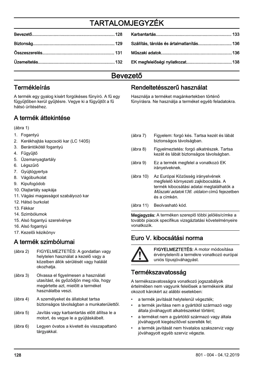 Transporte y almacenamiento Aperçu du produit (Fig. 1) 1. Poignée/Guidon 2. Manette de commande (LC 140S) 3. Poignée du câble du démarreur 4. Collecteur d'herbe 5. Réservoir de carburant 6. Filtre à air 7. Bougie 8. Capot de coupe 9. Silencieux 10. Bouchon du réservoir d'huile 11. Levier de hauteur de coupe 12. Couvercle arrière 13. Poignée de frein moteur 14. Symboles 15. Ensemble de poignée inférieure Des avertissements, des recommandations et des remarques sont utilisés pour souligner des parties spécialement importantes du manuel. AVERTISSEMENT: Symbole utilisé en cas de risque de blessures ou de mort pour l'opérateur ou les personnes à proximité si les instructions du manuel ne sont pas respectées. REMARQUE: Symbole utilisé en cas de risque de dommages pour le produit, d'autres matériaux ou les environs si les instructions du manuel ne sont pas respectées. Remarque: Symbole utilisé pour donner des informations supplémentaires pour une situation donnée.
