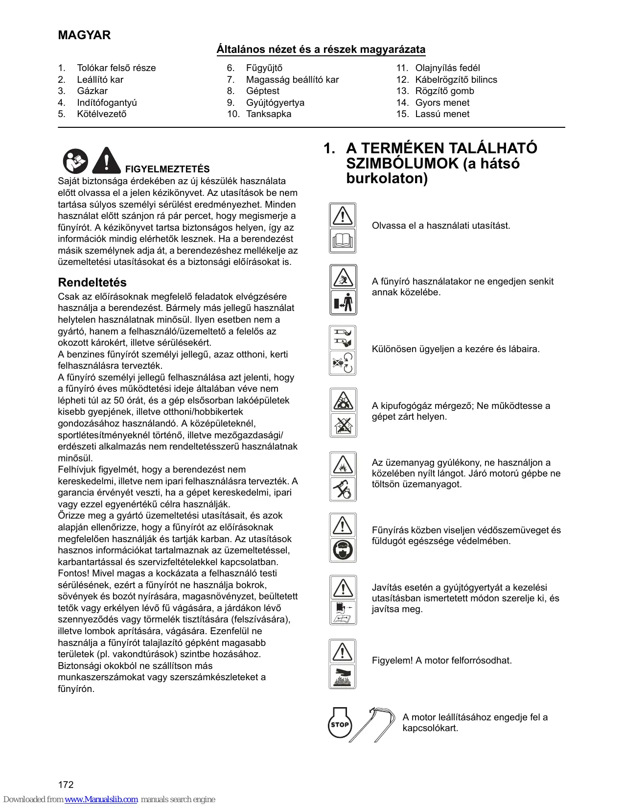 FIGYELMEZTETÉS Saját biztonsága érdekében az új készülék használata előtt olvassa el a jelen kézikönyvet. Az utasítások be nem tartása súlyos személyi sérülést eredményezhet. Minden használat előtt szánjon rá pár percet, hogy megismerje a fűnyírót. A kézikönyvet tartsa biztonságos helyen, így az információk mindig elérhetők lesznek. Ha a berendezést másik személynek adja át, a berendezéshez mellékelje az üzemeltetési utasításokat és a biztonsági előírásokat is.
