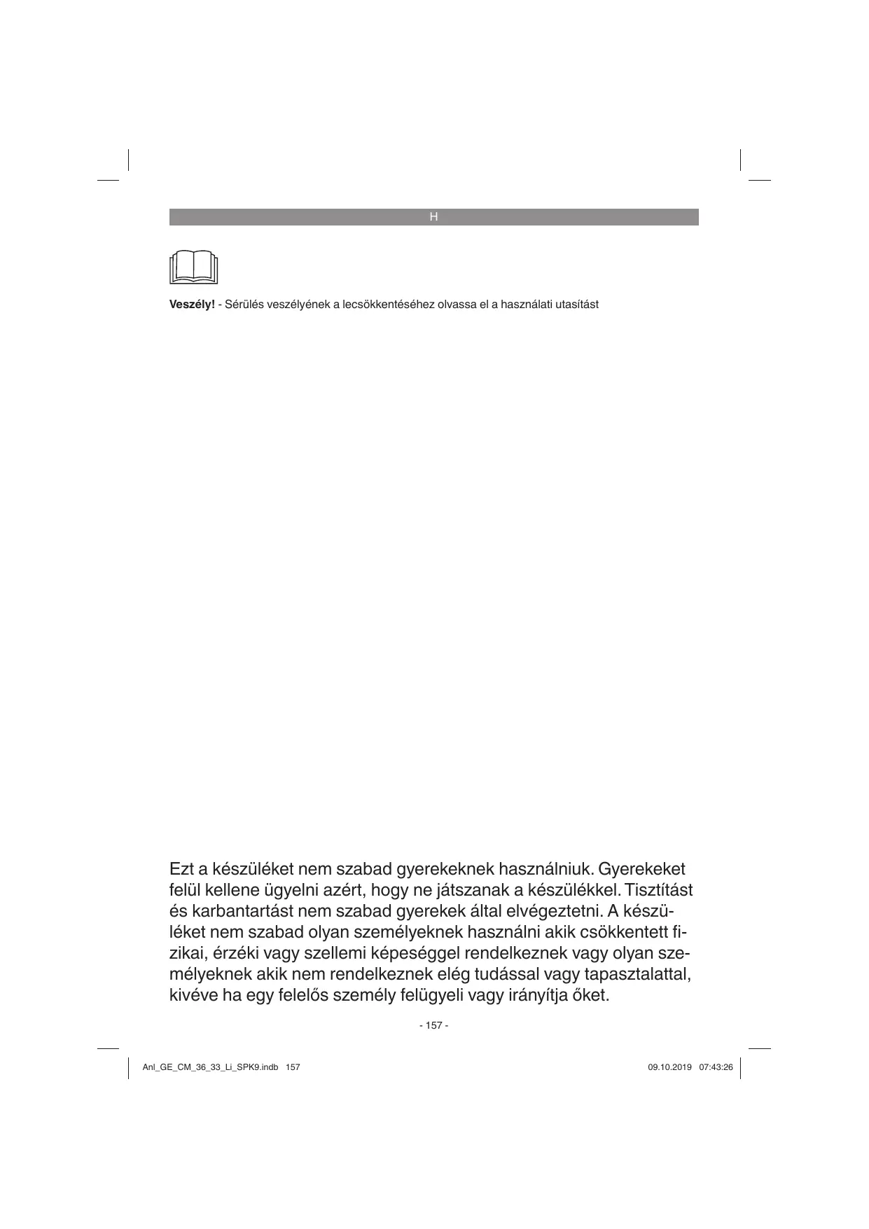 H Veszély! - Sérülés veszélyének a lecsökkentéséhez olvassa el a használati utasítást