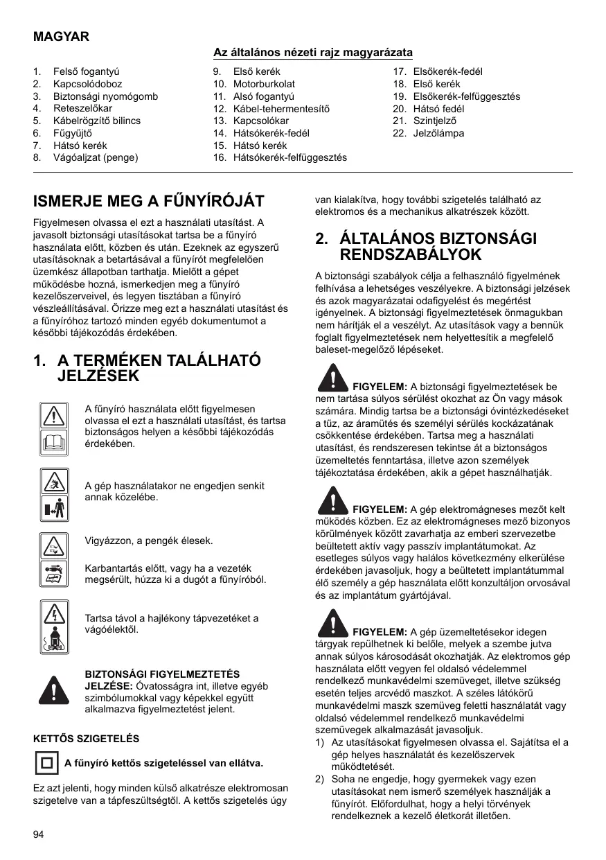 1. SYMBOLES MARQUÉS SUR LE PRODUIT Lisez ce manuel d’instructions attentivement avant d’utiliser la tondeuse et conservez-le dans un endroit sûr pour toute référence future.