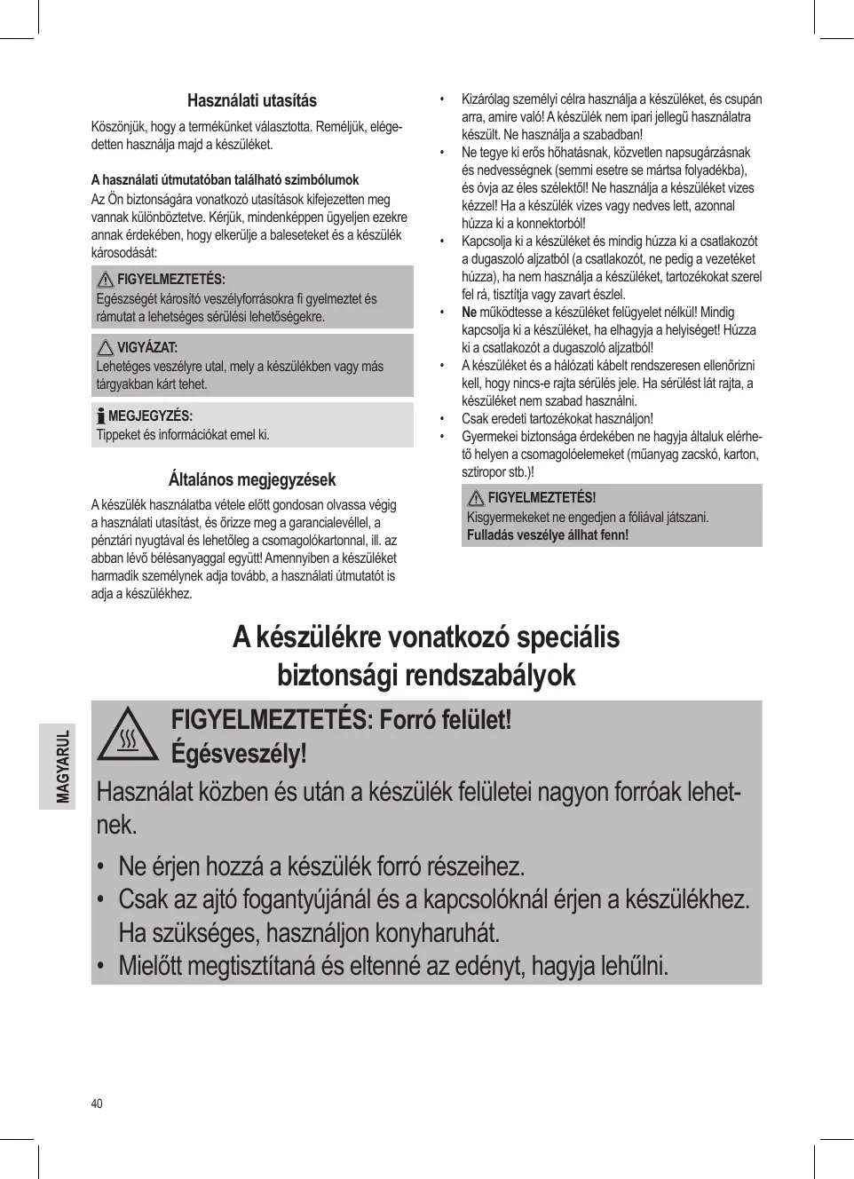 Általános megjegyzések A készülék használatba vétele előtt gondosan olvassa végig a használati utasítást, és őrizze meg a garancialevéllel, a pénztári nyugtával és lehetőleg a csomagolókartonnal, ill. az abban lévő bélésanyaggal együtt! Amennyiben a készüléket harmadik személynek adja tovább, a használati útmutatót is adja a készülékhez. Kizárólag személyi célra használja a készüléket, és csupán arra, amire való! A készülék nem ipari jellegű használatra készült. Ne használja a szabadban! Ne tegye ki erős hőhatásnak, közvetlen napsugárzásnak és nedvességnek (semmi esetre se mártsa folyadékba), és óvja az éles szélektől! Ne használja a készüléket vizes kézzel! Ha a készülék vizes vagy nedves lett, azonnal húzza ki a konnektorból! Kapcsolja ki a készüléket és mindig húzza ki a csatlakozót a dugaszoló aljzatból (a csatlakozót, ne pedig a vezetéket húzza), ha nem használja a készüléket, tartozékokat szerel fel rá, tisztítja vagy zavart észlel. Ne működtesse a készüléket felügyelet nélkül! Mindig kapcsolja ki a készüléket, ha elhagyja a helyiséget! Húzza ki a csatlakozót a dugaszoló aljzatból! A készüléket és a hálózati kábelt rendszeresen ellenőrizni kell, hogy nincs-e rajta sérülés jele. Ha sérülést lát rajta, a készüléket nem szabad használni. Csak eredeti tartozékokat használjon! Gyermekei biztonsága érdekében ne hagyja általuk elérhető helyen a csomagolóelemeket (műanyag zacskó, karton, sztiropor stb.)! FIGYELMEZTETÉS! Kisgyermekeket ne engedjen a fóliával játszani. Fulladás veszélye állhat fenn! A készülékre vonatkozó speciális biztonsági rendszabályok FIGYELMEZTETÉS: Forró felület! Égésveszély! Használat közben és után a készülék felületei nagyon forróak lehetnek.
