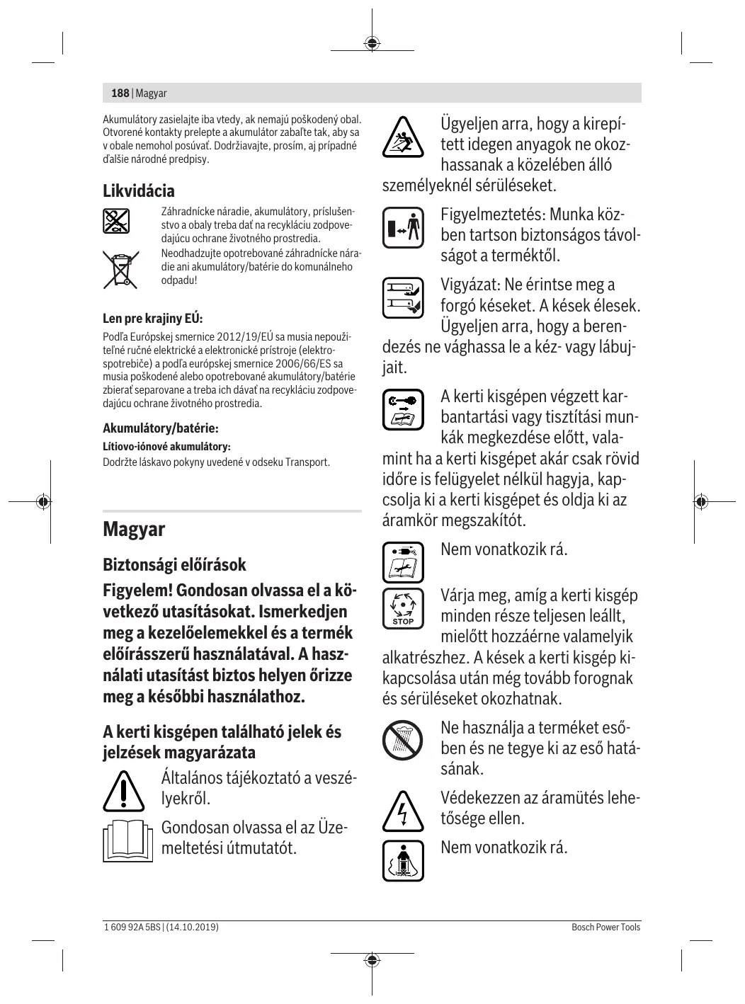 Bosch Power Tools Zástrčku sieťovej šnúry zasuňte do zásuvky (úplne) Skontrolujte sieťové napätie, nabíjačku dajte prípadne preskúšať v autorizovanej servisnej opravovni ručného elektrického náradia Bosch Zákaznícka služba a poradenstvo ohľadom použitia www.bosch-garden.com V prípade akýchkoľvek otázok a objednávok náhradných súčiastok uvádzajte bezpodmienečne 10‑miestne vecné číslo uvedené na typovom štítku výrobku. Slovakia Na www.bosch-pt.sk si môžete objednať opravu vášho stroja alebo náhradné diely online. Tel.: +421 2 48 703 800 Fax: +421 2 48 703 801 E-Mail: servis.naradia@sk.bosch.com www.bosch-pt.sk Transport Priložené lítiovo-iónové akumulátory podliehajú požiadavkám pre transport nebezpečného nákladu. Tieto akumulátory smie používateľ náradia prepravovať po cestách bez ďalších opatrení. Pri zasielaní tretími osobami (napr.: leteckou dopravou alebo prostredníctvom špedície) treba pamätať na osobitné požiadavky na obaly a označenie. V takomto prípade treba pri príprave zásielky bezpodmienečne konzultovať s expertom pre prepravu nebezpečného tovaru. 1 609 92A 5BS | (14.10.2019) 188 | Magyar Akumulátory zasielajte iba vtedy, ak nemajú poškodený obal. Otvorené kontakty prelepte a akumulátor zabaľte tak, aby sa v obale nemohol posúvať. Dodržiavajte, prosím, aj prípadné ďalšie národné predpisy. Likvidácia Záhradnícke náradie, akumulátory, príslušenstvo a obaly treba dať na recykláciu zodpovedajúcu ochrane životného prostredia. Neodhadzujte opotrebované záhradnícke náradie ani akumulátory/batérie do komunálneho odpadu! Len pre krajiny EÚ: Podľa Európskej smernice 2012/19/EÚ sa musia nepoužiteľné ručné elektrické a elektronické prístroje (elektrospotrebiče) a podľa európskej smernice 2006/66/ES sa musia poškodené alebo opotrebované akumulátory/batérie zbierať separovane a treba ich dávať na recykláciu zodpovedajúcu ochrane životného prostredia. Akumulátory/batérie: Lítiovo-iónové akumulátory: Dodržte láskavo pokyny uvedené v odseku Transport. Magyar Biztonsági előírások Figyelem! Gondosan olvassa el a következő utasításokat. Ismerkedjen meg a kezelőelemekkel és a termék előírásszerű használatával. A használati utasítást biztos helyen őrizze meg a későbbi használathoz. A kerti kisgépen található jelek és jelzések magyarázata Általános tájékoztató a veszélyekről. Gondosan olvassa el az Üzemeltetési útmutatót. 1 609 92A 5BS | (14.10.2019) Ügyeljen arra, hogy a kirepített idegen anyagok ne okozhassanak a közelében álló személyeknél sérüléseket. Figyelmeztetés: Munka közben tartson biztonságos távolságot a terméktől. Vigyázat: Ne érintse meg a forgó késeket. A kések élesek. Ügyeljen arra, hogy a berendezés ne vághassa le a kéz- vagy lábujjait. A kerti kisgépen végzett karbantartási vagy tisztítási munkák megkezdése előtt, valamint ha a kerti kisgépet akár csak rövid időre is felügyelet nélkül hagyja, kapcsolja ki a kerti kisgépet és oldja ki az áramkör megszakítót. Nem vonatkozik rá. Várja meg, amíg a kerti kisgép minden része teljesen leállt, mielőtt hozzáérne valamelyik alkatrészhez. A kések a kerti kisgép kikapcsolása után még tovább forognak és sérüléseket okozhatnak. Ne használja a terméket esőben és ne tegye ki az eső hatásának. Védekezzen az áramütés lehetősége ellen. Nem vonatkozik rá. Bosch Power Tools Magyar | 189 A töltőkészüléket csak száraz helyiségekben szabad használni. A töltőkészülék egy biztonsági transzformátorral van felszerelve. A kerti kisgép tisztításához ne használjon nagynyomású tisztítót vagy kerti locsolótömlőt. Gondosan ellenőrizze azt a területet, ahol a kerti kisgépet használni akarja, nincsenek-e ott háziállatok vagy más állatok. A gép működése során a háziállatok vagy más állatok sérüléseket szenvedhetnek. Gondosan vizsgálja meg a gép használati területét és távolítson el minden követ, botot, drótot, csontot és minden más idegen tárgyat. A gép használata közben ügyeljen arra, hogy ne lehessenek nem látható háziállatok, más állatok vagy fatönkök a sűrű gyep alatt. Kezelés u Sohase engedje meg gyerekeknek, vagy az ezen előírásokat nem ismerő személyeknek, hogy a terméket használják. Az Ön országában érvényes előírások lehet, hogy korlátozzak a kezelő korát. Ha a terméket nem használja, azt gyermekek számára nem elérhető helyen tárolja. u Sohase engedje meg, hogy gyermekek, korlátozott fizikai, érzékelési vagy szellemi képességű, illetve kellő tapasztalattal és/vagy tudással nem Bosch Power Tools rendelkező és/vagy az ezen utasításokat nem jól ismerő személyek ezt a terméket használják. Az Ön országában érvényes előírások lehet, hogy korlátozzak a kezelő korát. u A gyerekeket felügyelni kell, hogy garantálni lehessen, hogy a termékkel ne játsszanak. u Sohase használja a kerti kisgépet, ha személyek, mindenek előtt gyerekek vagy háziállatok, tartózkodnak a közvetlen közelében. u A más személyek által elszenvedett balesetekért, illetve a más tulajdonában keletkezett károkért a kezelő vagy felhasználó felel. u Na használjon nyitott gumicipőt vagy szandált, amikor a terméket használja. Viseljen mindig stabil lábbelit és hosszú nadrágot. u Gondosan vizsgálja meg a megmunkálni kívánt területet, és távolítsa el a köveket, botokat, drótokat, csontokat és egyéb idegen tárgyakat. u A használat előtt mindig ellenőrizze, nincsenek-e elkopva vagy megrongálódva a kés, a kés csavarjai és a vágó egység. Az elhasználódott vagy megrongálódott késeket és késcsavarokat mindig teljes készletként cserélje ki, hogy elkerülje a kiegyensúlyozatlanságot. u Csak nappali fénynél vagy jó mesterséges meg