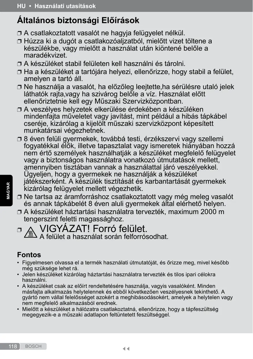 készülékbe, vagy mielőtt a használat után kiöntené belőle a maradékvizet. A készüléket stabil felületen kell használni és tárolni. Ha a készüléket a tartójára helyezi, ellenőrizze, hogy stabil a felület, amelyen a tartó áll. Ne használja a vasalót, ha előzőleg leejtette,ha sérülésre utaló jelek láthatók rajta,vagy ha szivárog belőle a víz. Használat előtt ellenőriztetnie kell egy Műszaki Szervizközpontban. A veszélyes helyzetek elkerülése érdekében a készüléken mindenfajta műveletet vagy javítást, mint például a hibás tápkábel cseréje, kizárólag a kijelölt műszaki szervizközpont képesített munkatársai végezhetnek. 8 éven felüli gyermekek, továbbá testi, érzékszervi vagy szellemi fogyatékkal élők, illetve tapasztalat vagy ismeretek hiányában hozzá nem értő személyek használhatják a készüléket megfelelő felügyelet vagy a biztonságos használatra vonatkozó útmutatások mellett, amennyiben tisztában vannak a használattal járó veszélyekkel. Ügyeljen, hogy a gyermekek ne használják a készüléket játékszerként. A készülék tisztítását és karbantartását gyermekek kizárólag felügyelet mellett végezhetik. Ne tartsa az áramforráshoz csatlakoztatott vagy még meleg vasalót és annak tápkábelét 8 éven aluli gyermekek által elérhető helyen. A készüléket háztartási használatra tervezték, maximum 2000 m tengerszint feletti magassághoz.