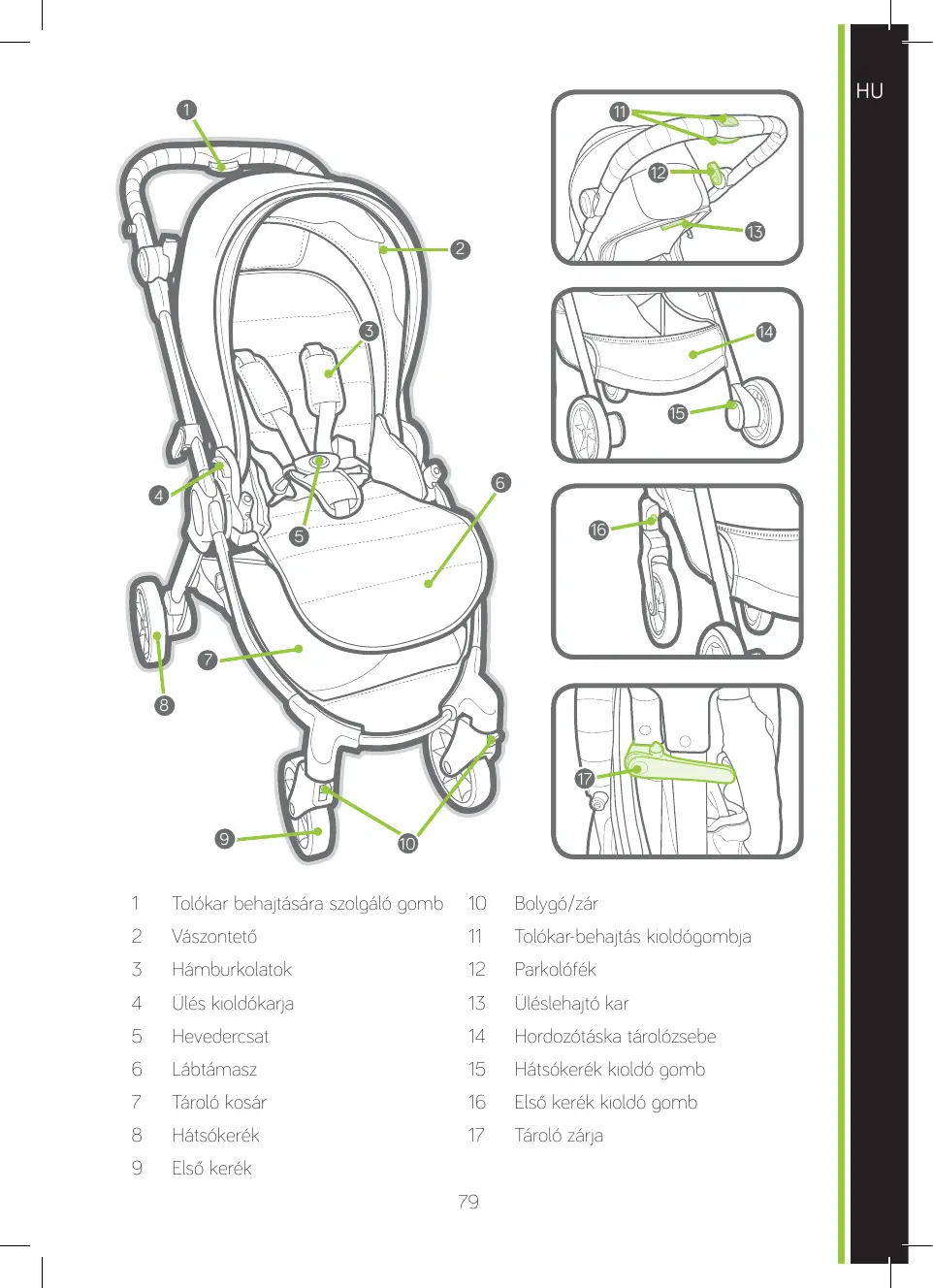 VÁZ 1 Csomagolja ki a babakocsi vázát a dobozból és tegye félre a kerekeket. Oldja ki a babakocsit oly módon, hogy meghúzza a Tárolás alatti rögzítésre szolgáló kart. 2. Emelje le az elülső gyerekkocsivázat a hátsó gyerekkocsivázról. 3. Emelje fel a felső vázat, és emelje le az alsó vázról. 4. Forgassa a tolókart felfelé. A babakocsi rögzül a helyén, amit egy kattanás jelez. FIGYELMEZTETÉS: Ügyeljen rá, hogy a rögzítő berendezések használat előtt be legyenek kapcsolva. FIGYELMEZTETÉS: A mozgó alkatrészek a gyerekkocsi összecsukása és kinyitása során sérülést okozhatnak. Gyermekek ne legyenek a közelben a termék kinyitása és összecsukása során. ELSŐ KERÉK 5 Beszerelés • Fektesse a hátára a babakocsit úgy, hogy a tolókar a padlón feküdjön. • Csatlakoztassa az Első kereket oly módon, hogy becsúsztatja az első keréktartóra, amíg be nem kattan. Az Első kereket gyengéden meghúzva ellenőrizze, hogy a helyére kattant-e. 6 Levétel • Az első kerék kioldógombját lenyomva gyengéden csúsztassa le az Első kereket az első keréktartóról BOLYGÓKERÉK FUNKCIÓ 7 A lezáró bolygógomb felfelé tolásával rögzítse az első kereket egy fix pozícióban. 8 A lezáró bolygógomb lefelé nyomásával tegye lehetővé az első kerékszerelvény forgását. FIGYELMEZTETÉS: A gyermek beültetésekor vagy kiemelésekor rögzítse az első kereket fix állásban. Bár rögzül a babakocsi első kereke, nem arra készült, hogy kocogjanak vagy tornagyakorlatot végezzenek vele.