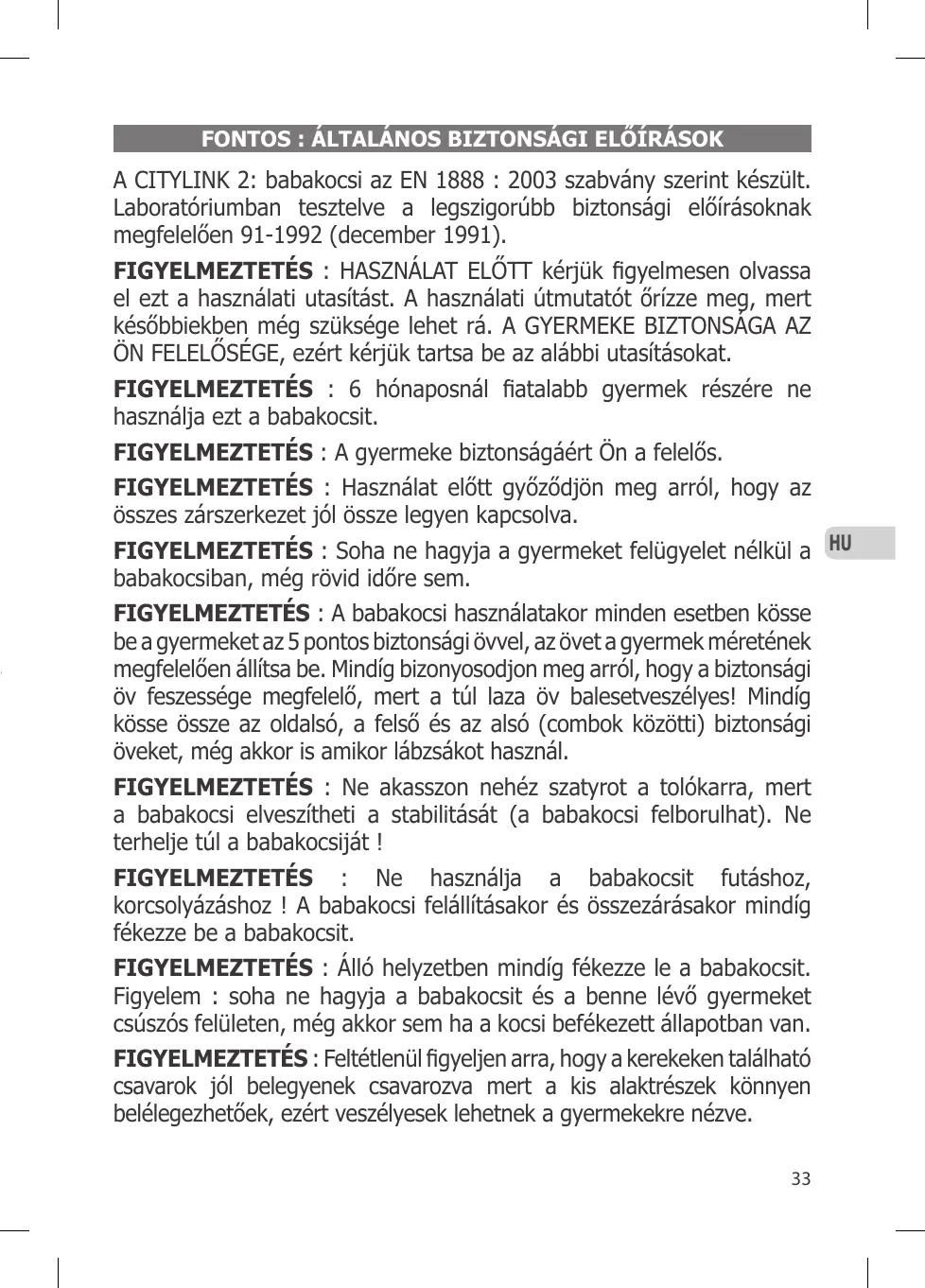 AVERTISSEMENT: Vous êtes responsable de la sécurité de votre enfant. FR AVERTISSEMENT: S’assurer que tous les dispositifs de verrouillage sont correctement enclenchés avant utilisation. AVERTISSEMENT: Il peut être dangereux de laisser votre enfant sans surveillance. AVERTISSEMENT: En toutes circonstances, attachez l’enfant avec le harnais de sécurité à 5 points ajusté à sa taille lorsque vous utilisez la poussette. Toujours utiliser la sangle de l’entrejambe avec le harnais de sécurité, même si vous utilisez une chancelière. AVERTISSEMENT: Le fait d’accrocher au poussoir une charge influe sur la stabilité de la poussette / du landau. AVERTISSEMENT: Ne pas utiliser ce produit en faisant du jogging ou des promenades en rollers. AVERTISSEMENT: Utilisez toujours le frein arrière au pied pour immobiliser la poussette. AVERTISSEMENT: Vous devez veiller à ce que les molettes et les bouchons des valves soient fermement vissés sur les roues pour éviter tout risque dû à la présence de petits éléments susceptibles d’être ingérés. AVERTISSEMENT: Ne jamais utiliser l’entrejambe sans la ceinture de maintien. AVERTISSEMENT: Utilisez un harnais dès que l’enfant peut tenir assis tout seul. 27