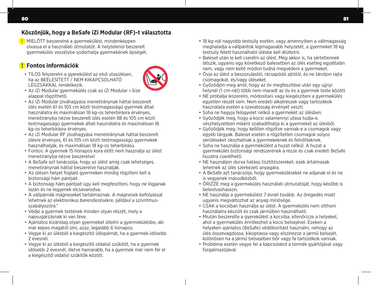 !! Fontos információk • TILOS felszerelni a gyerekülést az első utasülésen, ha az BEÉLESÍTETT / NEM KIKAPCSOLHATÓ LÉGZSÁKKAL rendelkezik. • Az iZi Modular gyermekülés csak az iZi Modular i-Size alappal rögzíthető. • Az iZi Modular jóváhagyása menetiránynak háttal beszerelt ülés esetén 61 és 105 cm közti testmagasságú gyermek általi használatra és maximálisan 18 kg-os teherbírásra érvényes, menetirányba nézve beszerelt ülés esetén 88 és 105 cm közti testmagasságú gyermekek általi használatra és maximálisan 18 kg-os teherbírásra érvényes. • Az iZi Modular RF jóváhagyása menetiránynak háttal beszerelt ülésre érvényes, 61 és 105 cm közti testmagasságú gyermekek használhatják, és maximálisan 18 kg-os teherbírású. • Fontos: A gyermek 15 hónapos kora előtt nem használja az ülést menetirányba nézve beszerelve! • A BeSafe azt tanácsolja, hogy az ülést amíg csak lehetséges, menetiránynak háttal beszerelve használják. • Az ülésen helyet foglaló gyermeken mindig rögzíteni kell a biztonsági hám pántjait. • A biztonsági hám pántjait úgy kell megfeszíteni, hogy ne lógjanak lazán és ne legyenek elcsavarodva. • A vállpárnák mágneseket tartalmaznak. A mágnesek befolyással lehetnek az elektronikus berendezésekre, például a szívritmusszabályozóra.” • Védje a gyermek testének minden olyan részét, mely a napsugárzásnak ki van téve. • Ajánlatos kizárólag olyan gyermeket ültetni a gyermekülésbe, aki már képes magától ülni, azaz, legalább 6 hónapos. • Vegye ki az ülésből a kiegészítő üléspárnát, ha a gyermek idősebb 2 évesnél. • Vegye ki az ülésből a kiegészítő oldalsó szűkítőt, ha a gyermek idősebb 2 évesnél, illetve hamarabb, ha a gyermek már nem fér el a kiegészítő oldalsó szűkítők között.