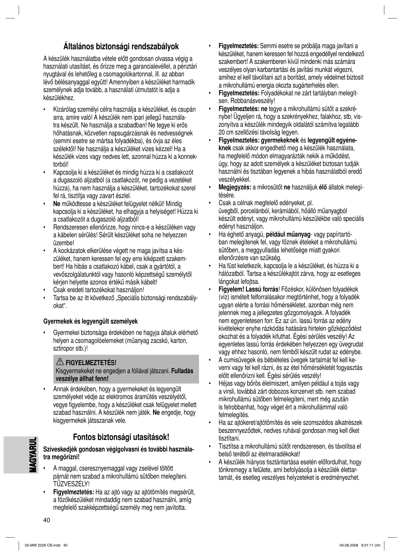 Figyelmeztetés: Semmi esetre se próbálja maga javítani a készüléket, hanem keressen fel hozzá engedéllyel rendelkező szakembert! A szakemberen kívül mindenki más számára veszélyes olyan karbantartási és javítási munkát végezni, amihez el kell távolítani azt a borítást, amely védelmet biztosít a mikrohullámú energia okozta sugárterhelés ellen. Figyelmeztetés: Folyadékokat ne zárt tartályban melegítsen. Robbanásveszély! Figyelmeztetés: ne tegye a mikrohullámú sütőt a szekrénybe! Ügyeljen rá, hogy a szekrényekhez, falakhoz, stb, viszonyítva a készülék mindegyik oldalától számítva legalább 20 cm szellőzési távolság legyen. Figyelmeztetés: gyermekeknek és legyengült egyéneknek csak akkor engedhető meg a készülék használata, ha megfelelő módon elmagyarázták nekik a működést, úgy, hogy az adott személyek a készüléket biztosan tudják használni és tisztában legyenek a hibás használatból eredő veszélyekkel. Megjegyzés: a mikrosütőt ne használjuk élő állatok melegítésére. Csak a célnak megfelelő edényeket, pl. üvegből, porcelánból, kerámiából, hőálló műanyagból készült edényt, vagy mikrohullámú készülékbe való speciális edényt használjon. Ha éghető anyagú, például műanyag- vagy papírtartóban melegítenek fel, vagy főznek ételeket a mikrohullámú sütőben, a meggyulladás lehetősége miatt gyakori ellenőrzésre van szükség. Ha füst keletkezik, kapcsolja le a készüléket, és húzza ki a hálózatból. Tartsa a készülékajtót zárva, hogy az esetleges lángokat lefojtsa. Figyelem! Lassú forrás! Főzéskor, különösen folyadékok (víz) ismételt felforralásakor megtörténhet, hogy a folyadék ugyan elérte a forrási hőmérsékletet, azonban még nem jelennek meg a jellegzetes gőzgomolyagok. A folyadék nem egyenletesen forr. Ez az ún. lassú forrás az edény kivételekor enyhe rázkódás hatására hirtelen gőzképződést okozhat és a folyadék kifuthat. Égési sérülés veszély! Az egyenletes lassú forrás érdekében helyezzen egy üvegrudat vagy ehhez hasonló, nem fémből készült rudat az edénybe. A cumisüvegek és bébiételes üvegek tartalmát fel kell keverni vagy fel kell rázni, és az étel hőmérsékletét fogyasztás előtt ellenőrizni kell. Égési sérülés veszély! Héjas vagy bőrös élelmiszert, amilyen például a tojás vagy a virsli, továbbá zárt dobozos konzervet stb. nem szabad mikrohullámú sütőben felmelegíteni, mert még azután is felrobbanhat, hogy véget ért a mikrohullámmal való felmelegítés. Ha az ajtókeret/ajtótömítés és vele szomszédos alkatrészek beszennyeződtek, nedves ruhával gondosan meg kell őket tisztítani. Tisztítsa a mikrohullámú sütőt rendszeresen, és távolítsa el belső teréből az ételmaradékokat! A készülék hiányos tisztántartása esetén előfordulhat, hogy tönkremegy a felülete, ami befolyásolja a készülék élettartamát, és esetleg veszélyes helyzeteket is eredményezhet.