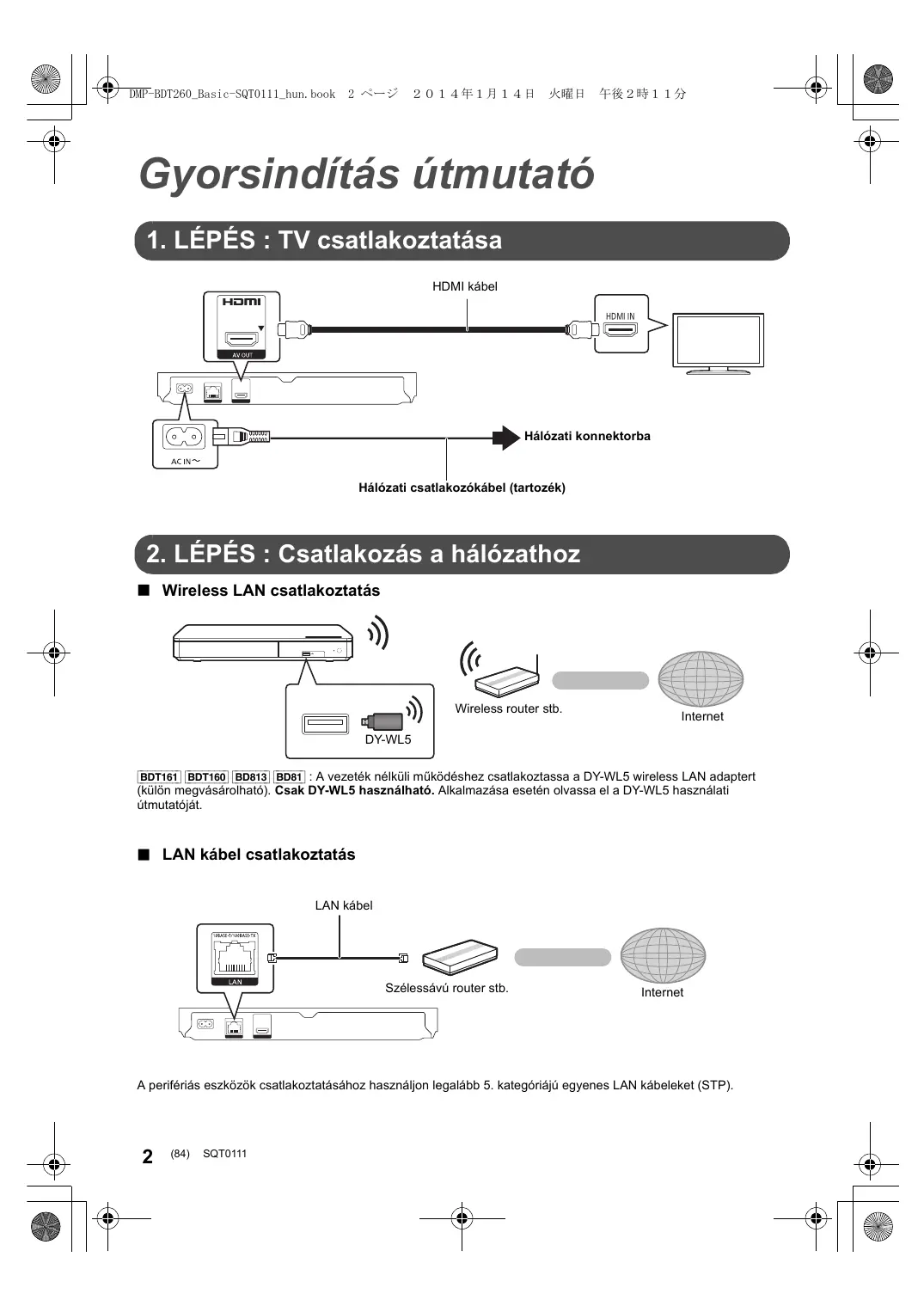 ∫ Wireless LAN csatlakoztatás Wireless router stb. Internet DY-WL5 [BDT161] [BDT160] [BD813] [BD81] : A vezeték nélküli működéshez csatlakoztassa a DY-WL5 wireless LAN adaptert (külön megvásárolható). Csak DY-WL5 használható. Alkalmazása esetén olvassa el a DY-WL5 használati útmutatóját. ∫ LAN kábel csatlakoztatás LAN kábel Szélessávú router stb. Internet A perifériás eszközök csatlakoztatásához használjon legalább 5. kategóriájú egyenes LAN kábeleket (STP).