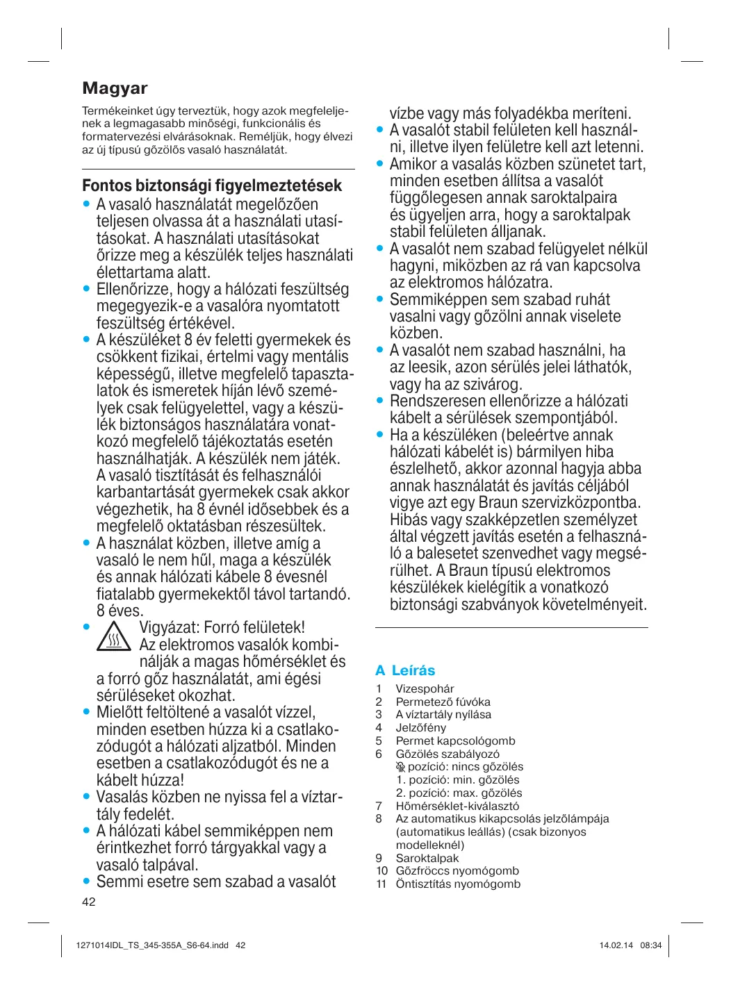 - Ha a készüléken (beleértve annak hálózati kábelét is) bármilyen hiba észlelhető, akkor azonnal hagyja abba annak használatát és javítás céljából vigye azt egy Braun szervizközpontba. Hibás vagy szakképzetlen személyzet által végzett javítás esetén a felhasználó a balesetet szenvedhet vagy megsérülhet. A Braun típusú elektromos készülékek kielégítik a vonatkozó biztonsági szabványok követelményeit. A Leírás