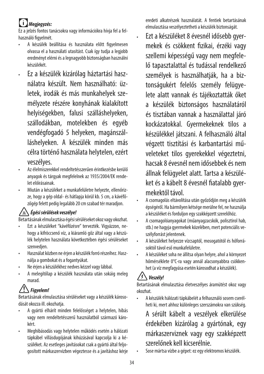 • Pendant l’utilisation ne touchez pas les surfaces chaudes de l’appareil. Utilisez les poignées ou les manches. • Évitez de toucher l’appareil les mains ou les pieds mouillés ou humides. • La plaque chauffante reste chaude après l’utilisation.