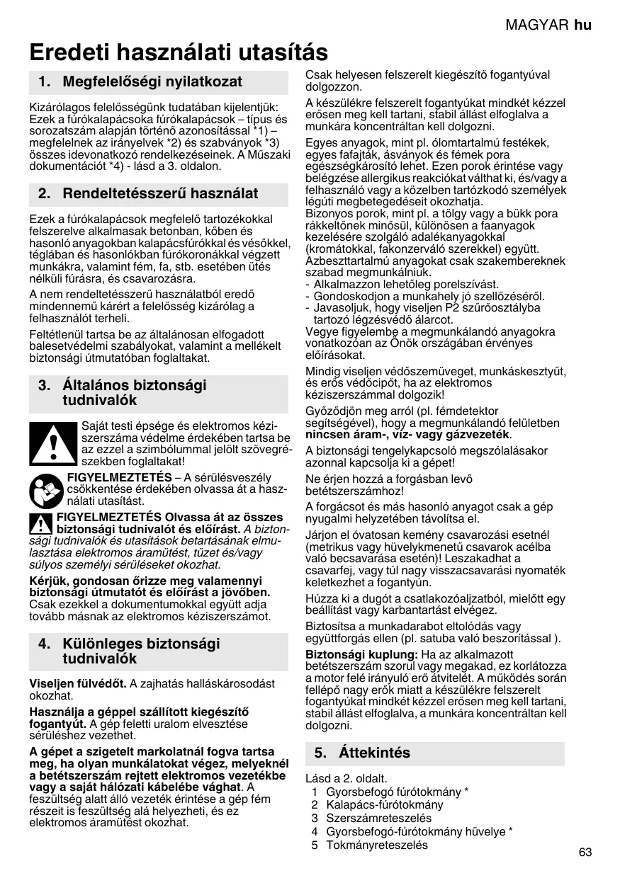 2. Utilisation conforme à la destination Equipé des accessoires correspondants, ces perceuses à percussion sont prévues pour travailler avec des forets marteau et des burins dans le béton, la pierre ou des matériaux similaires, et avec des trépans dans les tuiles, etc., ainsi que pour percer sans percussion dans le métal, le bois, etc. ou pour serrer des vis. L'utilisateur sera entièrement responsable de tous dommages résultant d'une utilisation non conforme à la destination de l'appareil. Il est impératif de respecter les consignes générales de protection contre les accidents ainsi que les consignes de sécurité ci-jointes.