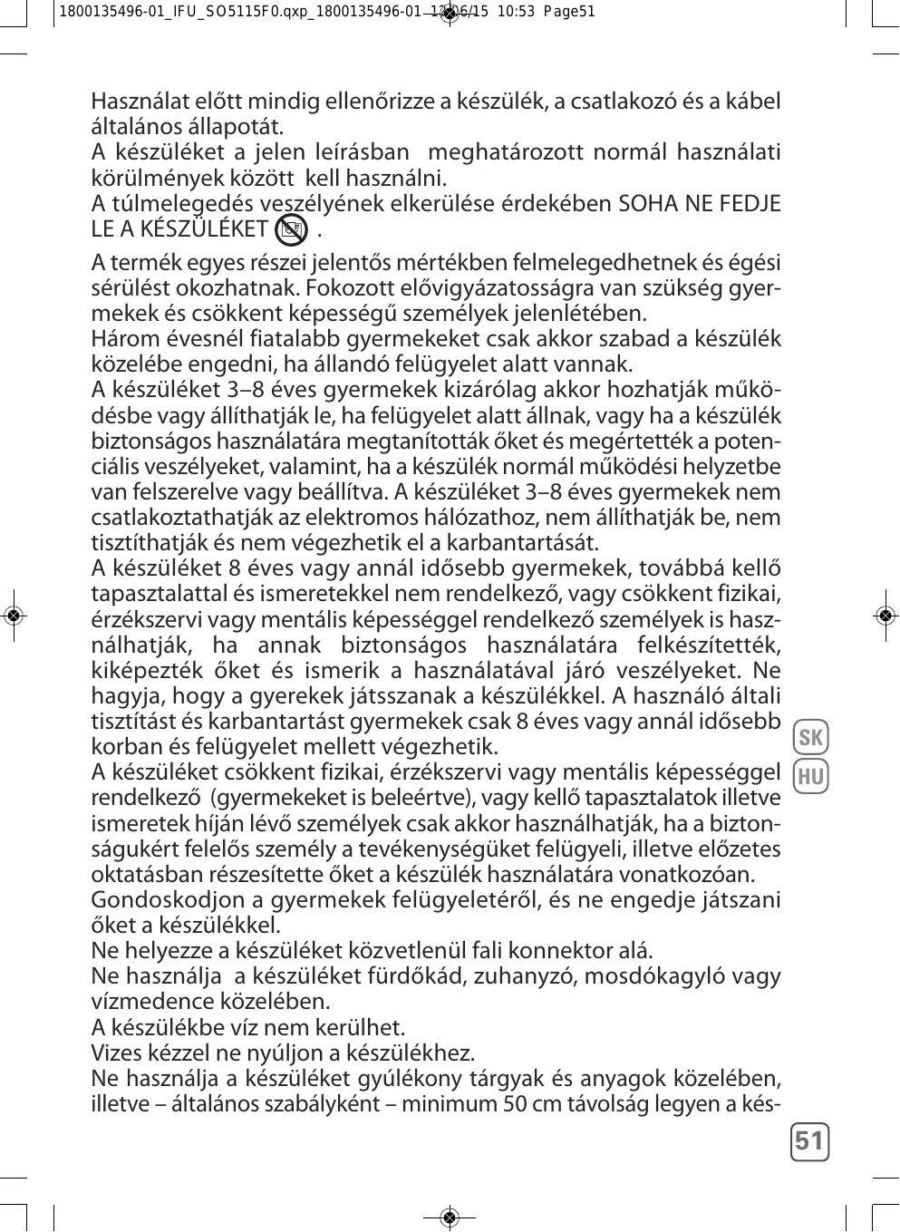 Afin d’éviter des risques de surchauffe, NE JAMAIS COUVRIR L’ APPAREIL . Certaines parties de ce produit peuvent devenir très chaudes et provoquer des brûlures. Il faut prêter une attention particulière en présence d’enfants et de personnes vulnérables. Il convient de maintenir à distance de l’appareil les enfants de moins de 3 ans, à moins qu’ils ne soient sous une surveillance continue. Les enfants âgés de 3 à 8 ans doivent uniquement mettre l’appareil en marche ou à l’arrêt, à condition que ce dernier ait été placé ou installé dans sa position de fonctionnement normal attendu et que ces enfants soient sous surveillance ou aient reçu des instructions quant à l’utilisation de l’appareil en toute sécurité et en comprennent bien les dangers potentiels. Les enfants âgés de 3 ans à 8 ans ne doivent ni brancher, régler ni nettoyer l’appareil ou réaliser sa maintenance. Cet appareil peut être utilisé par des enfants âgés de 8 ans et plus et les personnes manquant d’expérience et de connaissance ou dont les capacités physiques, sensorielles ou mentales sont réduites, si elles ont été formées et encadrées quant à l’utilisation de l’appareil d’une manière sûre et connaissent les risques encourus. Les enfants ne doivent pas jouer avec l’appareil. Le nettoyage et l’entretien par l’utilisateur ne doit pas être fait par des enfants à moins qu’ils ne soient âgés de 8 ans et plus et supervisés. Cet appareil n’est pas prévu pour être utilisé par des personnes (y compris les enfants) dont les capacités physiques, sensorielles ou mentales sont réduites, ou des personnes dénuées d’expérience ou de connaissance, sauf si elles ont pu bénéficier, par l’intermédiaire d’une personne responsable de leur sécurité, d’une surveillance ou d’instructions préalables concernant l’utilisation de l’appareil. Il convient de surveiller les enfants pour s’assurer qu’ils ne jouent pas avec l’appareil. Ne pas placer votre appareil juste en dessous d’une prise de courant murale. Ne pas utiliser cet appareil à proximité d’une baignoire, douche, lavabo ou d’une piscine.