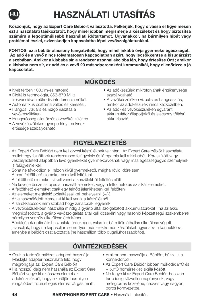 FIGYELMEZTETÉS - Az Expert Care Bébiőrt nem kell orvosi készüléknek tekinteni. Az Expert Care bébiőr használata mellett egy felnőttnek rendszeresen felügyelnie és látogatnia kell a kisbabát. Koraszülött vagy veszélyeztetett állapotban lévő gyerekeket gyermekorvosnak vagy más egészségügyis személynek is felügyelnie kell. - Soha ne távolodjon el házon kívül gyermekétől, mégha rövid időre sem. - A nem feltölthető elemeket nem kell feltölteni. - A feltölthető elemeket ki kell venni a készülékből feltöltés előtt. - Ne keverje össze az új és a használt elemeket, vagy a feltölthető és az alkáli elemeket. - A feltölthető elemeket csak egy felnőtt jelenlétében kell feltölteni. - Az elemeket megfelelő polaritással kell behelyezni (+/-). - Az elhasználódott elemeket ki kell venni a készülékből. - A sarokkapcsok nem szabad hogy zárlatosak legyenek. - A vevőkészülékben használja mindig a gyártó által szolgáltatott akkumulátorokat : ha az akku meghibásodott, a gyártó vevőszolgálata által kell kicserélni vagy hasonló képzettségű szakemberrel bármilyen veszély elkerülése érdekében. - Bébiőrjének optimális használata érdekében, valamint bármiféle áthallás elkerülése végett javasoljuk, hogy ne kapcsoljon semmilyen más elektromos készüléket ugyanarra a konnektorra, amelybe a bébiőrt csatlakoztatja (ne használjon több dugaljúhosszabbítót).