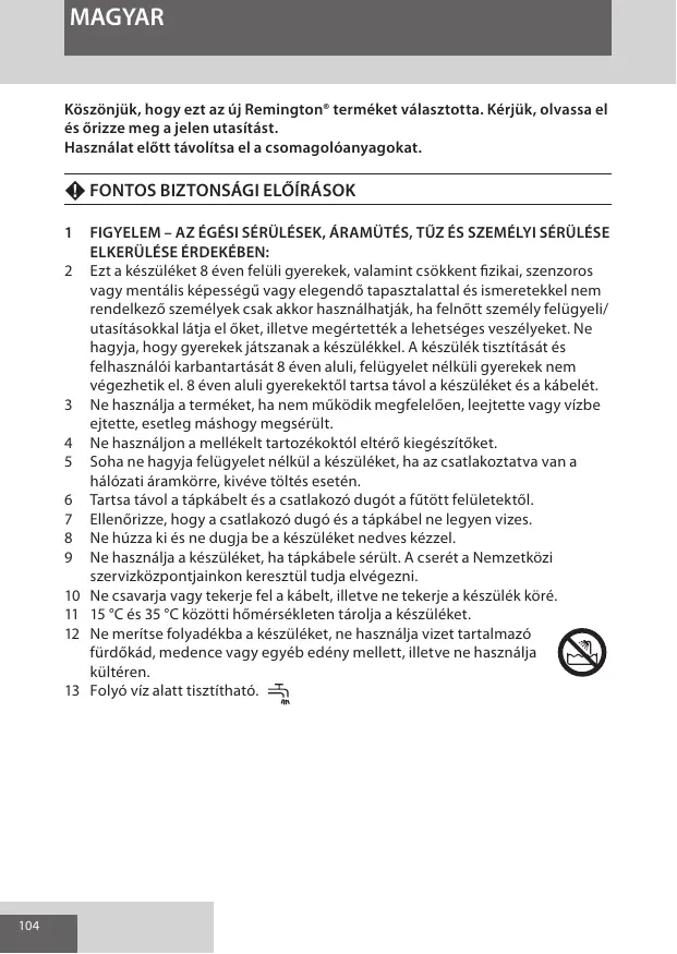 MAGYAR Köszönjük, hogy ezt az új Remington® terméket választotta. Kérjük, olvassa el és őrizze meg a jelen utasítást. Használat előtt távolítsa el a csomagolóanyagokat. F FONTOS BIZTONSÁGI ELŐÍRÁSOK