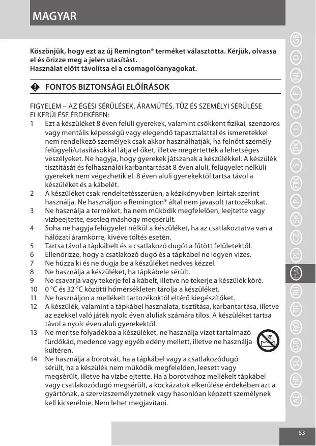 FIGYELEM – AZ ÉGÉSI SÉRÜLÉSEK, ÁRAMÜTÉS, TŰZ ÉS SZEMÉLYI SÉRÜLÉSE ELKERÜLÉSE ÉRDEKÉBEN: Ezt a készüléket 8 éven felüli gyerekek, valamint csökkent fizikai, szenzoros vagy mentális képességű vagy elegendő tapasztalattal és ismeretekkel nem rendelkező személyek csak akkor használhatják, ha felnőtt személy felügyeli/utasításokkal látja el őket, illetve megértették a lehetséges veszélyeket. Ne hagyja, hogy gyerekek játszanak a készülékkel. A készülék tisztítását és felhasználói karbantartását 8 éven aluli, felügyelet nélküli gyerekek nem végezhetik el. 8 éven aluli gyerekektől tartsa távol a készüléket és a kábelét. A készüléket csak rendeltetésszerűen, a kézikönyvben leírtak szerint használja. Ne használjon a Remington® által nem javasolt tartozékokat. Ne használja a terméket, ha nem működik megfelelően, leejtette vagy vízbeejtette, esetleg máshogy megsérült. Soha ne hagyja felügyelet nélkül a készüléket, ha az csatlakoztatva van a hálózati áramkörre, kivéve töltés esetén. Tartsa távol a tápkábelt és a csatlakozó dugót a fűtött felületektől. Ellenőrizze, hogy a csatlakozó dugó és a tápkábel ne legyen vizes. Ne húzza ki és ne dugja be a készüléket nedves kézzel. Ne használja a készüléket, ha tápkábele sérült. Ne csavarja vagy tekerje fel a kábelt, illetve ne tekerje a készülék köré. 10 0 °C és 32 °C közötti hőmérsékleten tárolja a készüléket. 11 Ne használjon a mellékelt tartozékoktól eltérő kiegészítőket. 12 A készülék, valamint a tápkábel használata, tisztítása, karbantartása, illetve az ezekkel való játék nyolc éven aluliak számára tilos. A készüléket tartsa távol a nyolc éven aluli gyerekektől. 13 Ne merítse folyadékba a készüléket, ne használja vizet tartalmazó fürdőkád, medence vagy egyéb edény mellett, illetve ne használja kültéren. 14 Ne használja a borotvát, ha a tápkábel vagy a csatlakozódugó sérült, ha a készülék nem működik megfelelően, leesett vagy megsérült, illetve ha vízbe ejtette. Ha a borotvához mellékelt tápkábel vagy csatlakozódugó megsérült, a kockázatok elkerülése érdekében azt a gyártónak, a szervizszemélyzetnek vagy hasonlóan képzett személynek kell kicserélnie. Nem lehet megjavítani.