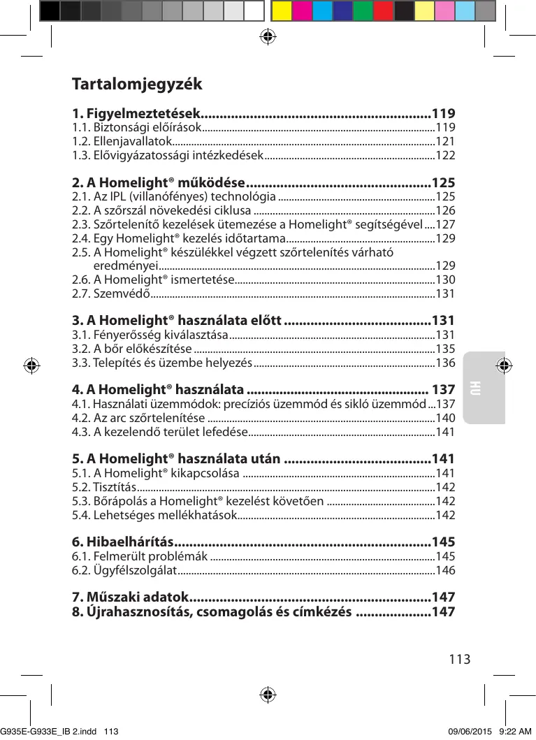 1.3. Elővigyázatossági intézkedések A nemkívánatos mellékhatások elkerülése érdekében a Homelight® használata bizonyos elővigyázatossági intézkedéseket követel: •N e alkalmazza a Homelight® készüléket sötét bőrön. Sötét bőrön végzett Homelight® kezelés hatására mellékhatásként égés, hólyagosodás vagy bőrszín-változás (hiper- vagy hipopigmentáció) léphet fel.
