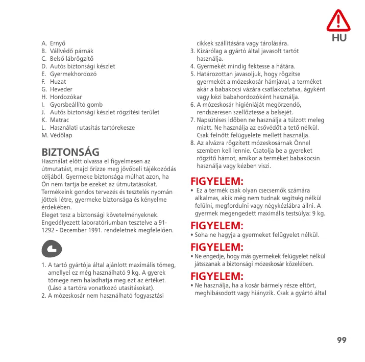 J. Autós biztonsági készlet rögzítési terület K. Matrac L. Használati utasítás tartórekesze M. Védőlap BIZTONSÁG Használat előtt olvassa el figyelmesen az útmutatást, majd őrizze meg jövőbeli tájékozódás céljából. Gyermeke biztonsága múlhat azon, ha Őn nem tartja be ezeket az útmutatásokat. Termékeink gondos tervezés és tesztelés nyomán jöttek létre, gyermeke biztonsága és kényelme érdekében. Eleget tesz a biztonsági követelményeknek. Engedélyezett laboratóriumban tesztelve a 911292 - December 1991. rendeletnek megfelelően. cikkek szállítására vagy tárolására.