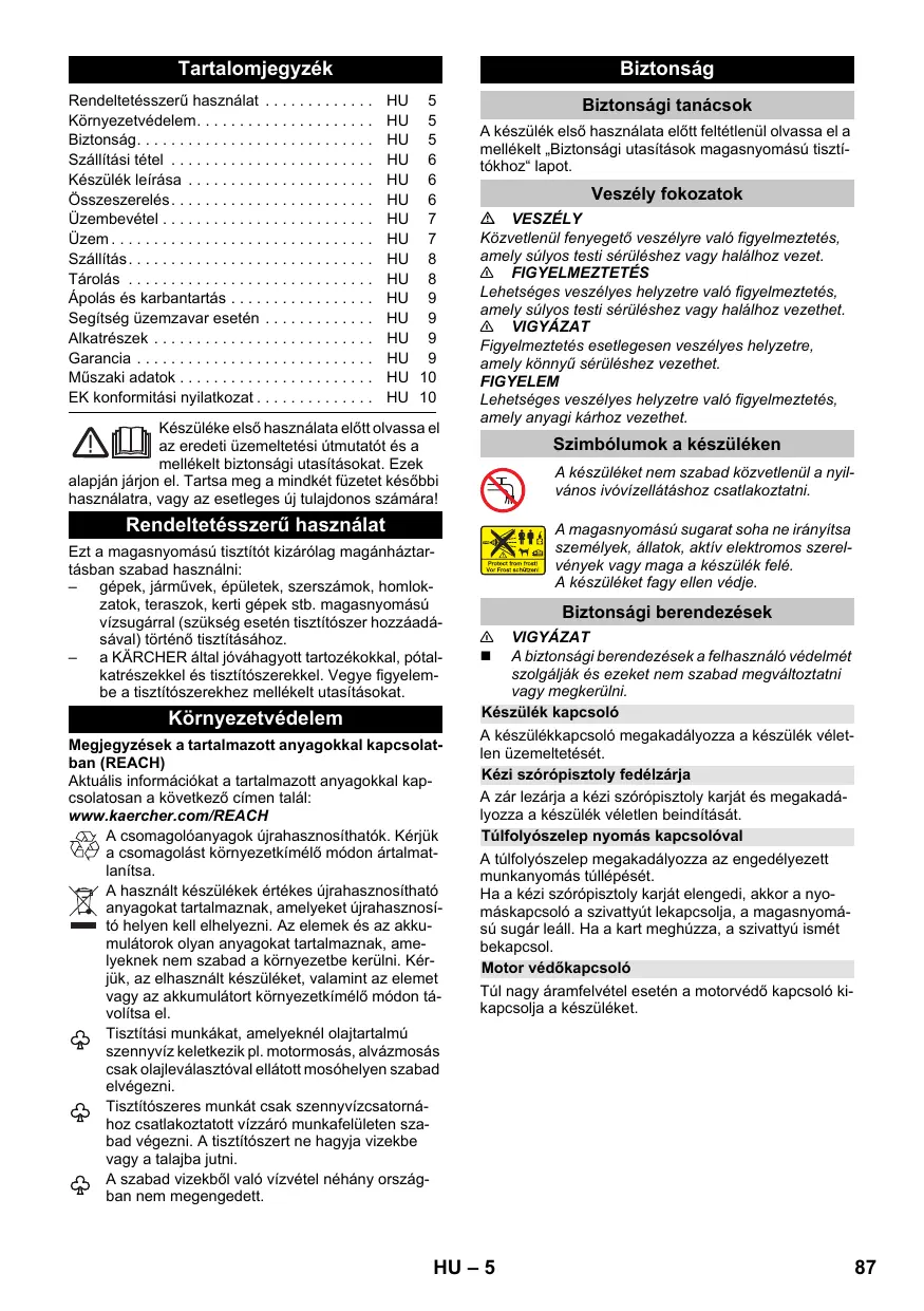 EN 60335–2–79 EN 61000–3–2: 2014 EN 61000–3–3: 2013 EN 62233: 2008 Procedimiento de evaluación de la conformidad aplicado 2000/14/CE: Anexo V Nivel de potencia acústica dB(A) Medido: 88 Garantizado: EN 60335–1 EN 60335–2–79 EN 61000–3–2: 2014 EN 61000–3–3: 2013 EN 62233: 2008 Processo aplicado de avaliação de conformidade 2000/14/CE: Anexo V Nível de potência acústica dB(A) Medido: 88 EN 60335–1 EN 60335–2–79 EN 61000–3–2: 2014 EN 61000–3–3: 2013 EN 62233: 2008 Anvendte overensstemmelsesvurderingsprocedurer 2000/14/EF: Bilag V Lydeffektniveau dB(A) Målt: EN 60335–1 EN 60335–2–79 EN 61000–3–2: 2014 EN 61000–3–3: 2013 EN 62233: 2008 Anvendt metode for samsvarsvurdering 2000/14/EF: Vedlegg V Lydeffektnivå dB(A) Målt: EN 60335–1 EN 60335–2–79 EN 61000–3–2: 2014 EN 61000–3–3: 2013 EN 62233: 2008 Tillämpad metod för överensstämmelsevärdering 2000/14/EG: Bilaga V Ljudeffektsnivå dB(A) Upmätt: EN 60335–1 EN 60335–2–79 EN 61000–3–2: 2014 EN 61000–3–3: 2013 EN 62233: 2008 Sovellettu yhdenmukaisuuden analysointimenetelmä 2000/14/EY: Liite V Äänen tehotaso dB(A) EN 60335–1 EN 60335–2–79 EN 61000–3–2: 2014 EN 61000–3–3: 2013 EN 62233: 2008 Εφαρμοσθείσα διαδικασία συμμόρφωσης 2000/14/EΚ: Παράρτημα V στάθμη ηχητικής πίεσης dB(A) EN 60335–1 EN 60335–2–79 EN 61000–3–2: 2014 EN 61000–3–3: 2013 EN 62233: 2008 Kullanılan uyumluluk değerlendirme yöntemleri 2000/14/EG: Ek V Ses şiddeti dB(A) Ölçülen: 88 EN 60335–1 EN 60335–2–79 EN 61000–3–2: 2014 EN 61000–3–3: 2013 EN 62233: 2008 Примененный порядок оценки соответствия 2000/14/ЕС: Приложение V Уровень мощности звука dB(A) EN 60335–1 EN 60335–2–79 EN 61000–3–2: 2014 EN 61000–3–3: 2013 EN 62233: 2008 Követett megfelelés megállapítási eljárás: 2000/14/EK: V. függelék Hangteljesítményszint dB(A) EN 60335–1 EN 60335–2–79 EN 61000–3–2: 2014 EN 61000–3–3: 2013 EN 62233: 2008 Použitý postup posuzování shody: 2000/14/ES: Příloha V Hladinu akustického dB(A) Namerenou: EN 60335–1 EN 60335–2–79 EN 61000–3–2: 2014 EN 61000–3–3: 2013 EN 62233: 2008 Postopek ocenjevanja skladnosti: 2000/14/ES: Priloga V Raven zvočne moči dB(A) Izmerjeno: EN 60335–1 EN 60335–2–79 EN 61000–3–2: 2014 EN 61000–3–3: 2013 EN 62233: 2008 Zastosowana metoda oceny zgodności 2000/14/WE: Załącznik V Poziom mocy akustycznej dB(A) Zmierzony: Trepte de pericol PERICOL Indicaţie referitoare la un pericol iminent, care duce la vătămări corporale grave sau moarte. 몇 AVERTIZARE Indicaţie referitoare la o posibilă situaţie periculoasă, care ar putea duce la vătămări corporale grave sau moarte. 몇 PRECAUŢIE Indică o posibilă situaţie periculoasă, care ar putea duce la vătămări corporale uşoare. ATENŢIE Indicaţie referitoare la o posibilă situaţie periculoasă, care ar putea duce la pagube materiale. Conectaţi furtunul de apă la sursa de alimentare cu apă. Deschideţi robinetul de apă în totalitate. Aspirarea apei din rezervoare deschise Acest aparat de curăţat sub presiune poate fi folosit cu furtunul de absorbţie KÄRCHER cu supapă de refulare (accesoriu special, nr. de comandă 2.643-100) şi este adecvat pentru aspirarea apei de la suprafaţă, de ex. din rezervoare cu apă de ploaie sau din iazuri (înălţimea maximă de aspirare vezi Datele tehnice). Indicaţie: În regim de aspirare nu este nevoie de cuplajul racordului de apă. Umpleţi cu apă furtunul de aspirare. Înşurubaţi furtunul de aspirare pe racordul de apă al aparatului şi atârnaţi-l într-un recipient cu apă (de ex. rezervorul de apă de ploaie). Evacuaţi aerul înainte de a utiliza aparatul după cum urmează: Porniţi aparatul „I/ON“. Deblocaţi maneta pistolului de pulverizat. Apăsaţi maneta pistolului manual de pulverizat, aparatul porneşte. Mizeria desprinsă se spală cu jetul de înaltă presiune. După utilizarea cu soluţie de curăţat Scoateţi flaconul Plug 'n' Clean din suport şi închideţi-l cu dop. Pentru depozitare aşezaţi flaconul de soluţie de curăţat cu dopul în sus în suport.