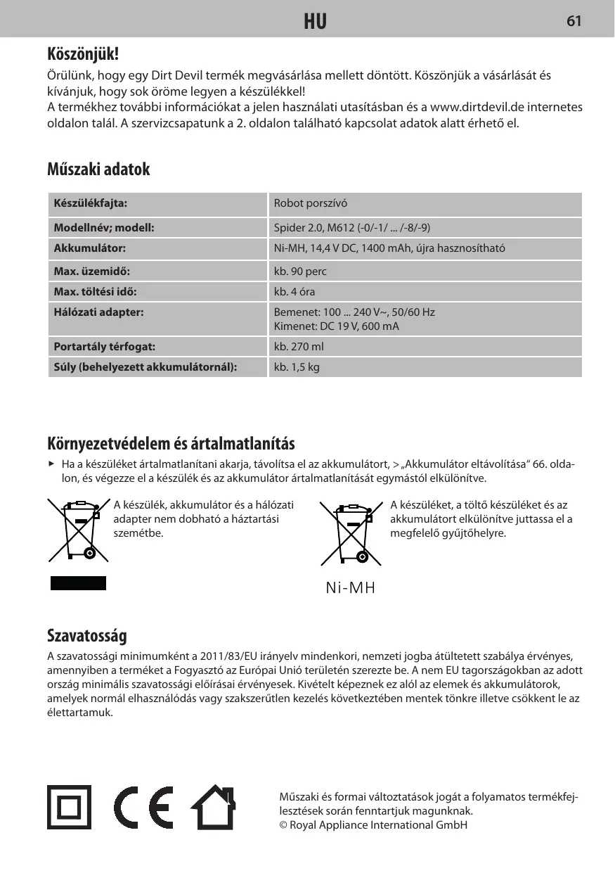 HASZNÁLATI ÚTMUTATÓ SPIDER 2,0 TRACKER M613 DIRT DEVIL